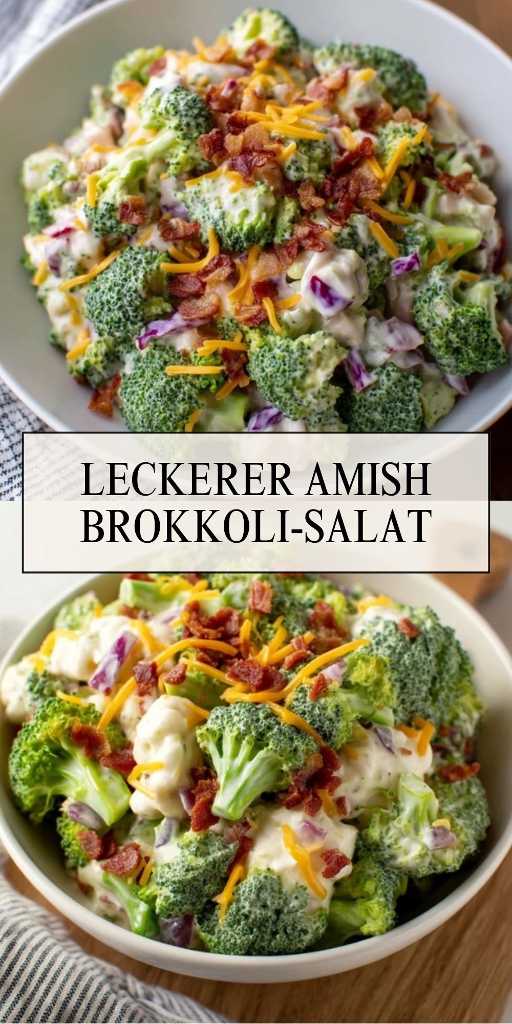 Amish Brokkoli-Salat ist der perfekte Begleiter für Grillabende, Picknicks oder als schnelle Beilage im Alltag. Die Kombination aus knackigem Brokkoli, würzigem Bacon, roten Zwiebeln und einem cremigen, leicht süßen Dressing sorgt für einen unvergleichlichen Geschmack. Dieser Salat überzeugt nicht nur durch seine frischen Zutaten, sondern auch durch die harmonische Balance von Herzhaftem und Süße – ein echter Klassiker aus der Amish-Küche!