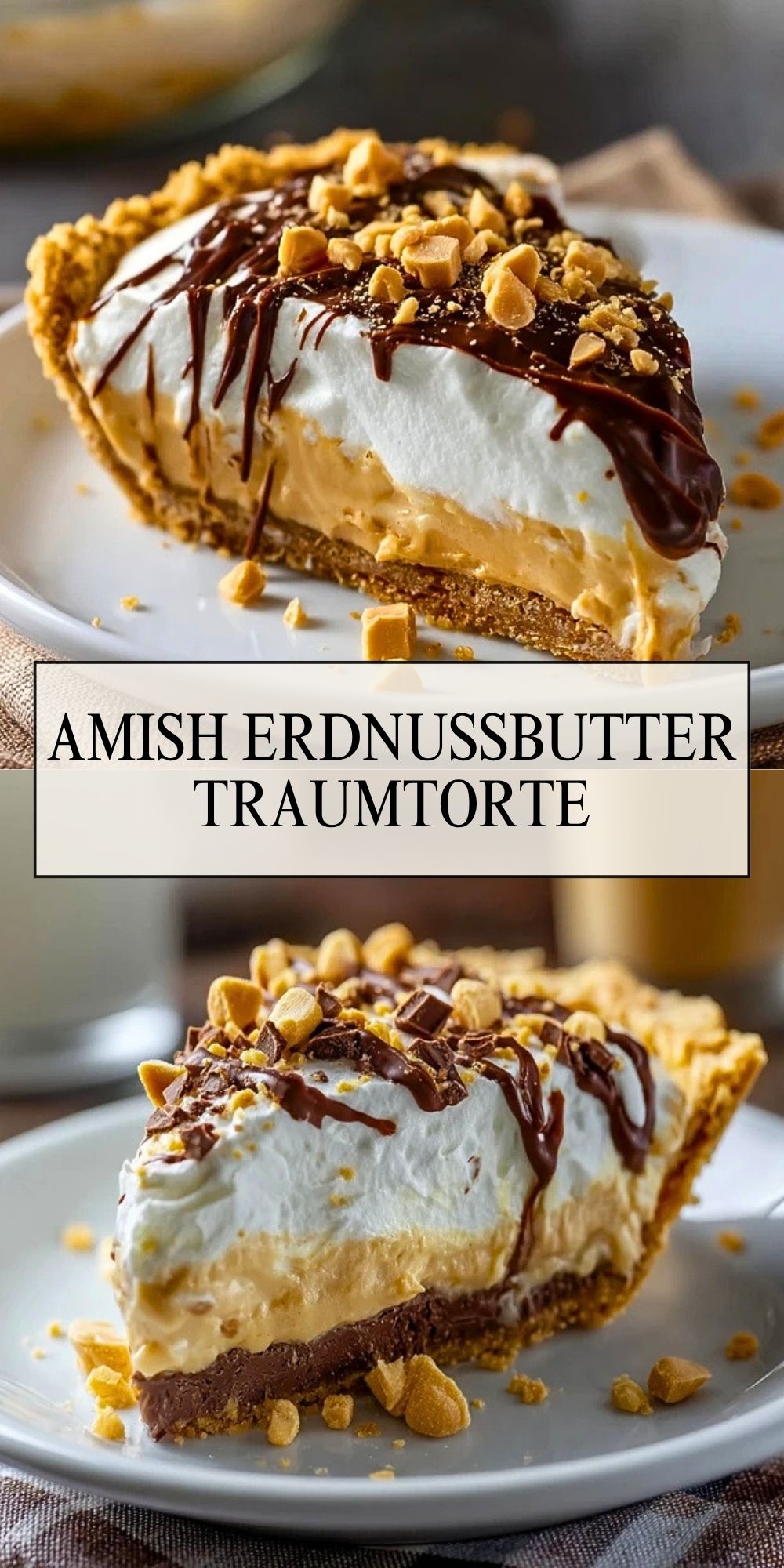 Eine herrlich cremige Amish Erdnussbutter-Traumtorte mit knusprigem Keksboden, samtiger Erdnussbutterfüllung, luftiger Sahneschicht und glänzender Schokoladenglasur – perfekt für Feiern, Kaffeetafeln und alle, die intensive Dessertklassiker lieben.