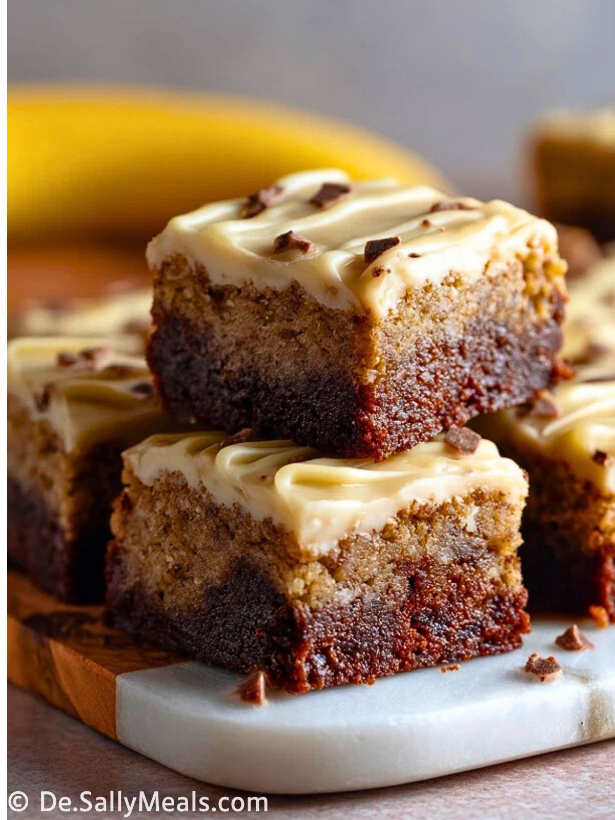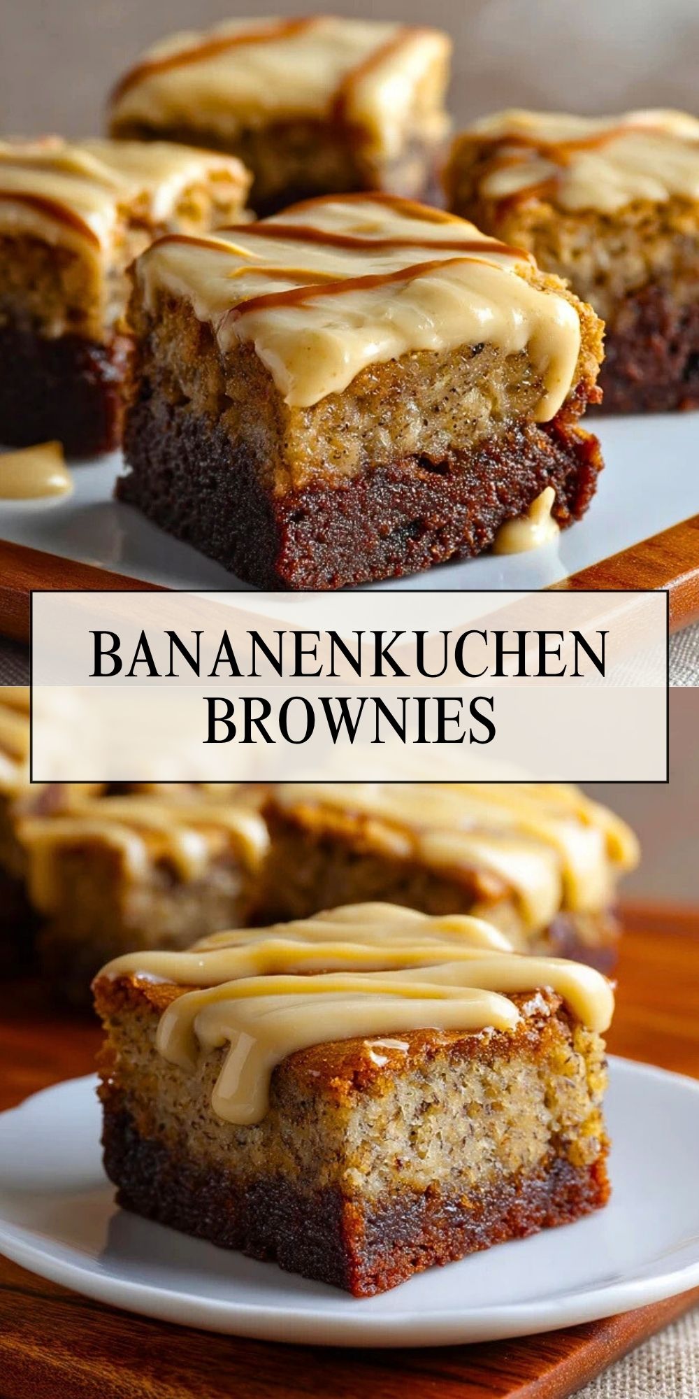 Gerade wenn ein paar sehr reife Bananen in der Küche liegen, ist dieses Rezept eine wunderbare Idee. Die Stücke lassen sich gut vorbereiten, sauber schneiden und sowohl zum Nachmittagskaffee als auch als süßer Abschluss eines Essens servieren. Mit einer cremigen Glasur und Bananenscheiben obendrauf wirken sie außerdem besonders einladend.