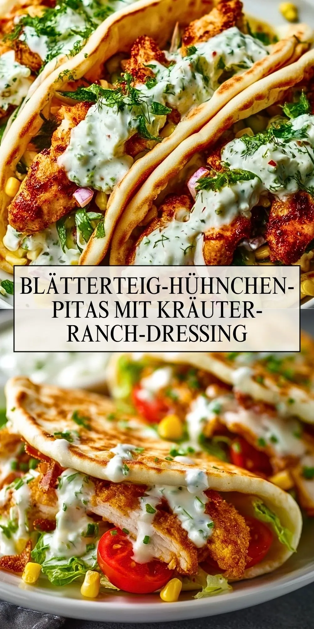 Knusprig gebratenes Hähnchen in Blätterteig, serviert in fluffigem Pita-Brot, mit knackigem Gemüse und einem frischen Kräuter-Ranch-Dressing. Dieses herzhafte Rezept ist ideal für ein unkompliziertes, aber raffiniertes Mittag- oder Abendessen mit viel Frische und Geschmack!