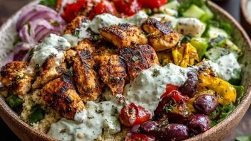 Griechische Hähnchen-Bowls mit cremiger Tahini-Feta-Sauce