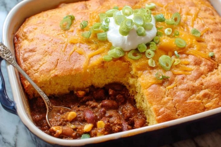 Chili mit Maisbrotauflauf ist ein herzhaftes Ofengericht, das würziges Chili mit einer goldgelben, fluffigen Maisbrotkruste kombiniert. Unten schmort eine kräftige Mischung aus Hackfleisch, Bohnen, Tomaten und Gewürzen, während sich oben eine leicht süßliche, weiche Maisbrotschicht bildet, die beim Backen wunderbar saftig bleibt. Genau dieser Kontrast macht das Gericht so beliebt: rustikal, sättigend und ideal für gemütliche Abende.