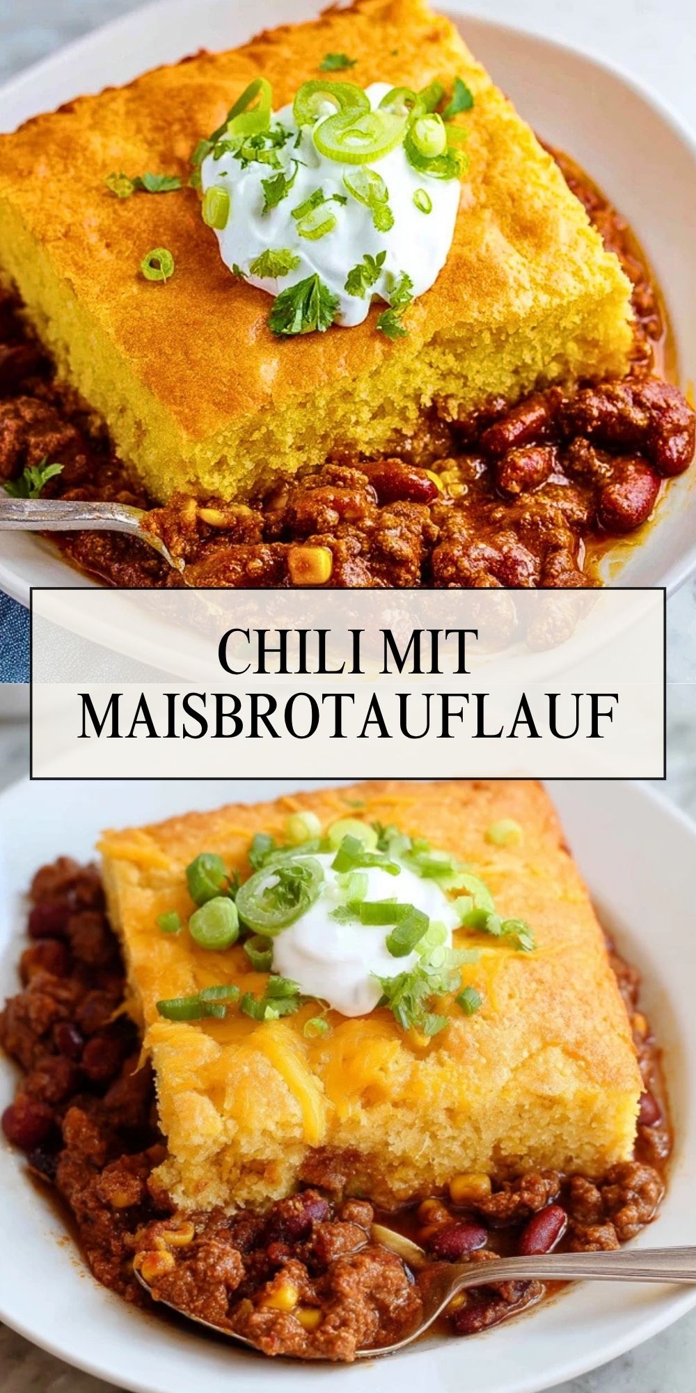 Maisbrot passt so gut zu Chili, weil seine lockere, leicht süßliche Struktur einen harmonischen Gegensatz zu den kräftigen, würzigen und tomatigen Aromen des Chilis bildet. Beim Backen saugt die untere Schicht zudem etwas Sauce auf, sodass sich beide Komponenten geschmacklich verbinden, ohne ihre eigene Textur zu verlieren. Das Ergebnis ist ein sättigendes Ofengericht, das rustikale Hausmannskost und angenehme Würze perfekt vereint.