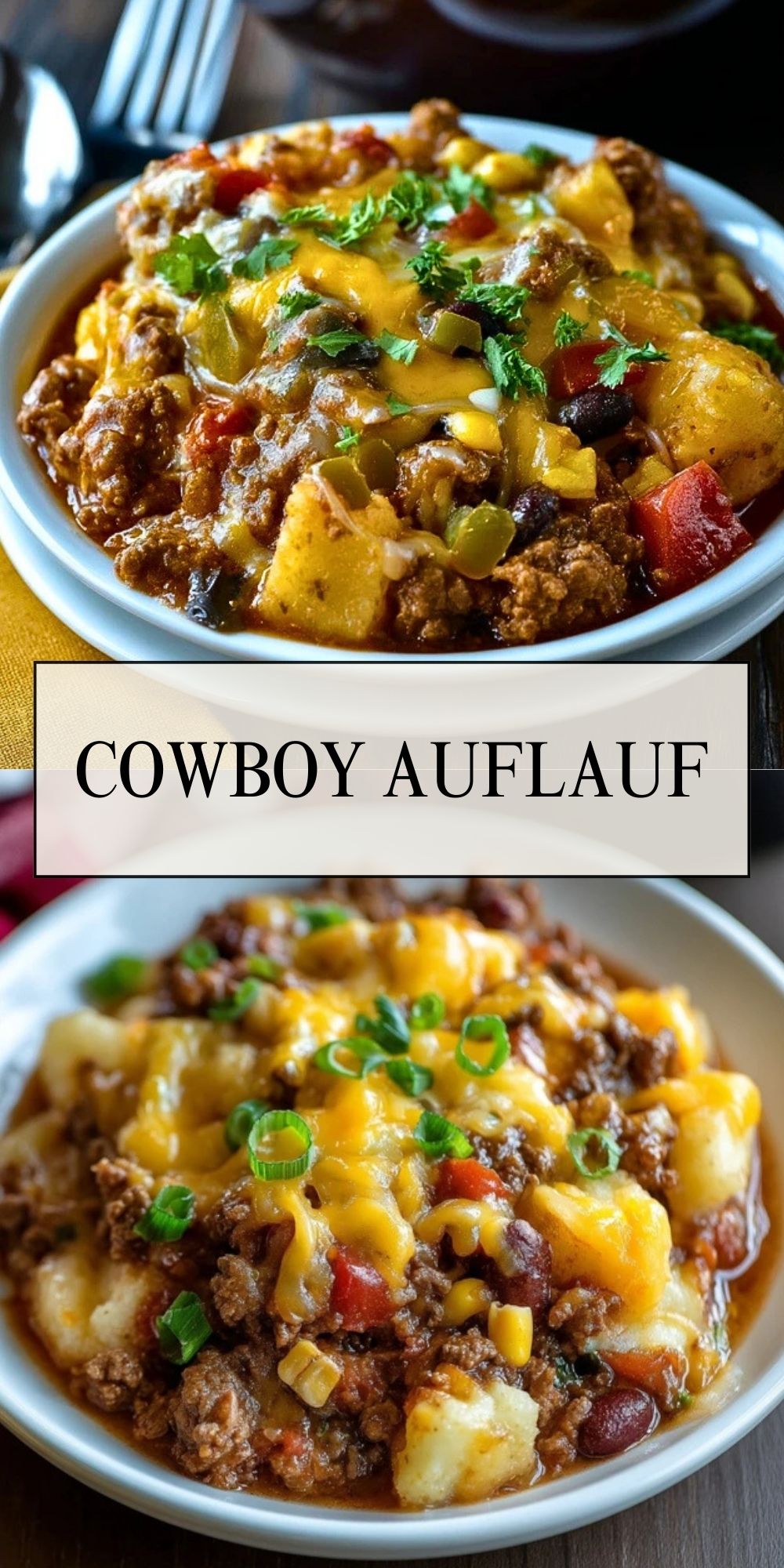 Ein herzhafter Auflauf mit würzigem Hackfleisch, zarten Kartoffelwürfeln, Bohnen und einer goldgelben Käsekruste. Cowboy Auflauf bringt echtes Western-Feeling und ist perfekt für gemütliche Abende mit Familie oder Freunden.