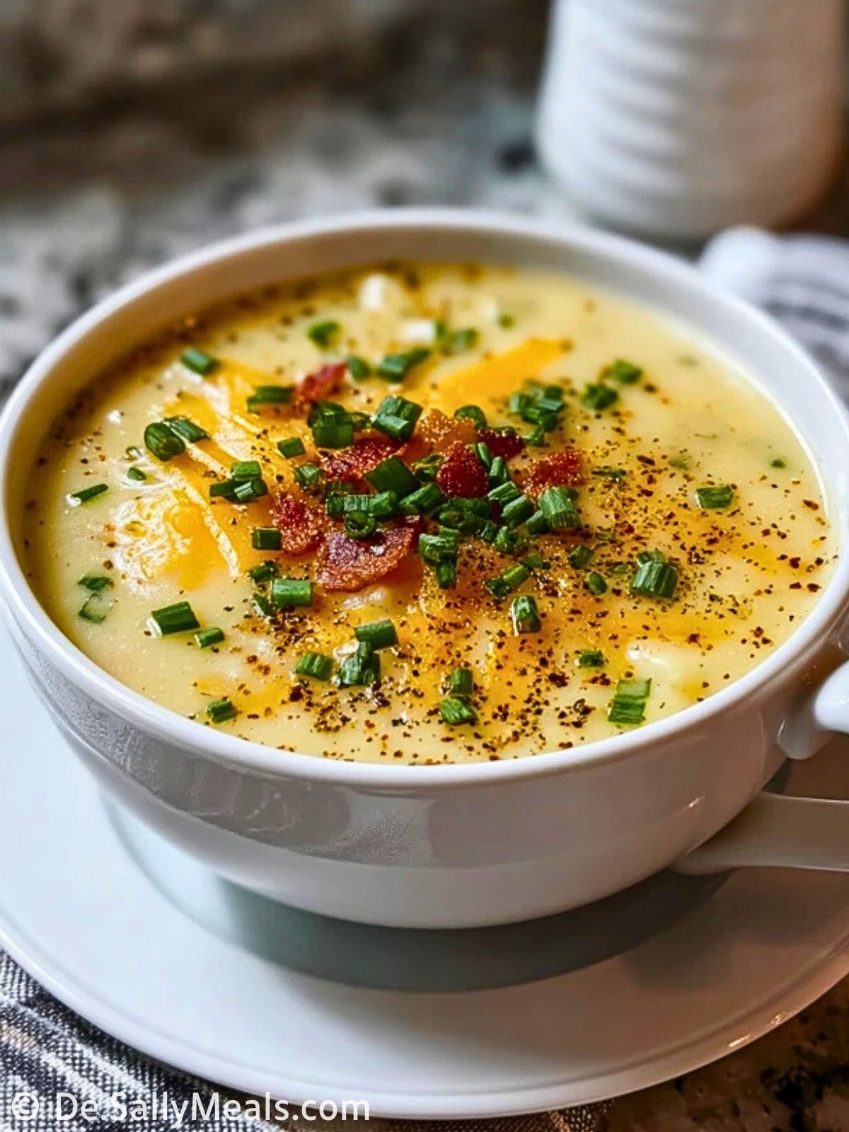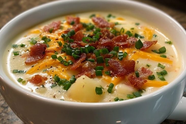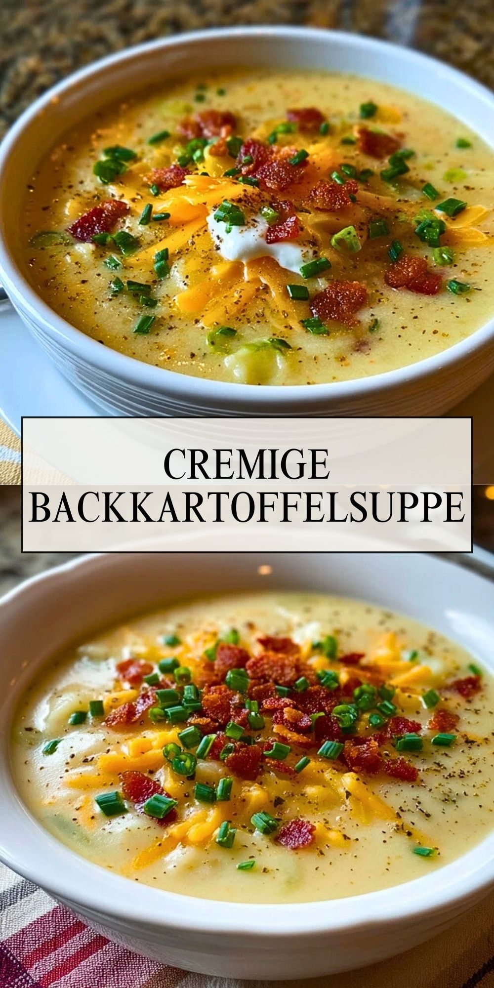 Diese cremige Backkartoffelsuppe vereint zarte Kartoffelwürfel, knusprigen Bacon und geschmolzenen Cheddar zu einer reichhaltigen, wärmenden Mahlzeit, die an klassische Ofenkartoffeln erinnert.
