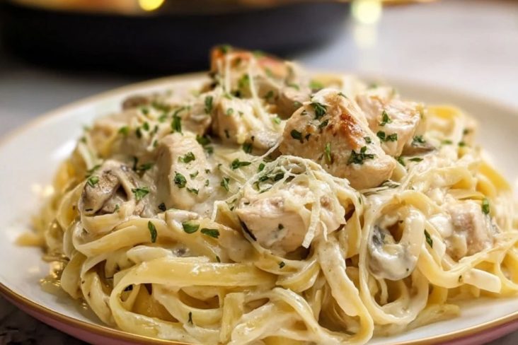 Cremige Fettuccine mit Hähnchen Alfredo sind ein herzhaftes Pastagericht mit zarten Hähnchenstücken, gebratenen Champignons und einer seidigen Parmesan-Sahne-Sauce. Dieses Rezept ist ideal für ein gemütliches Abendessen, lässt sich unkompliziert zubereiten und bringt viel Geschmack mit wenig Aufwand auf den Tisch.