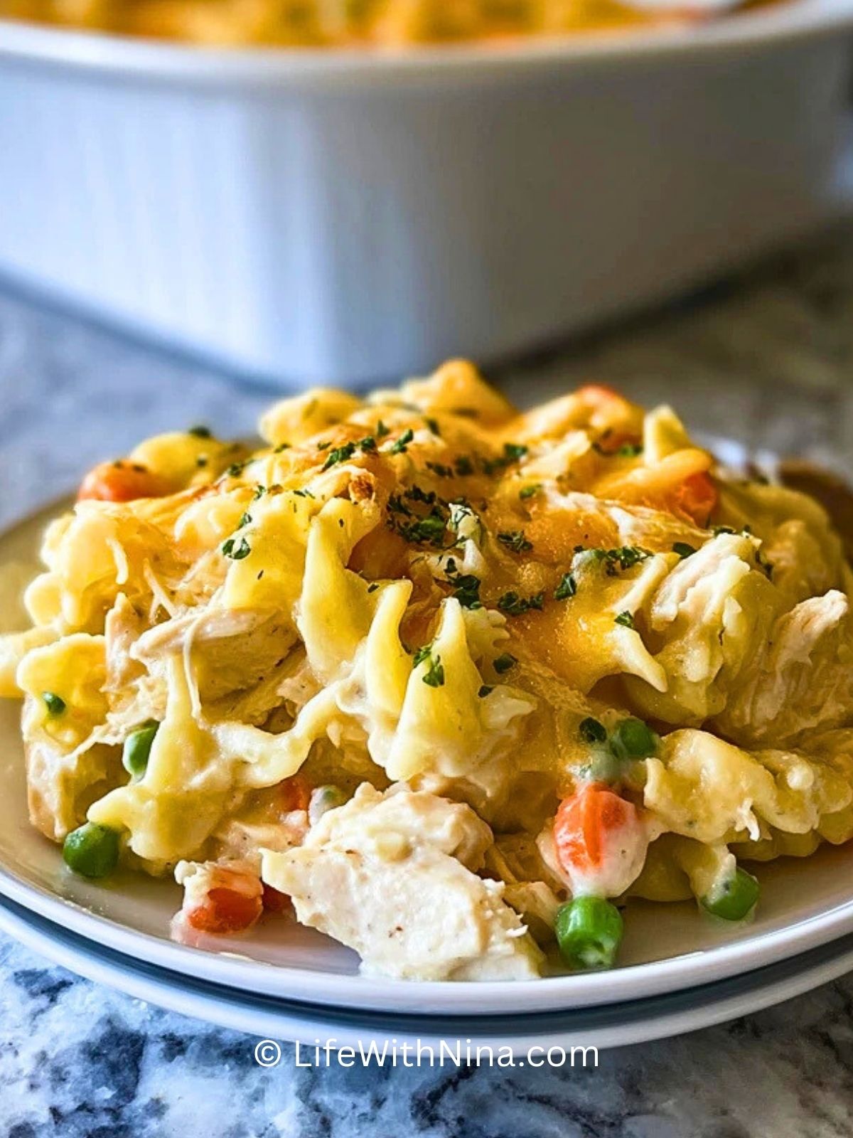 Cremiger Hühnchen-Nudelauflauf ist ein köstlicher Klassiker, der mit zartem Hähnchen, Eiernudeln, buntem Gemüse und einer herrlich sämigen Sauce überzeugt. Perfekt für Familienabende, einfach vorzubereiten und immer ein Genuss!