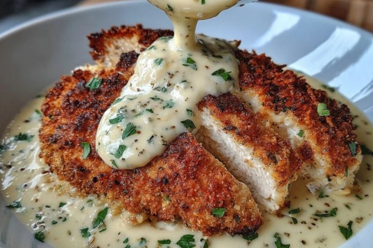 Cremiges Parmesan-Hähnchen mit Knoblauchsoße verbindet knusprig paniertes Hähnchenbrustfilet mit einer samtigen, aromatischen Knoblauch-Parmesan-Soße – ein echtes Wohlfühlgericht, das sich perfekt zu Pasta, Reis oder Kartoffelpüree servieren lässt.