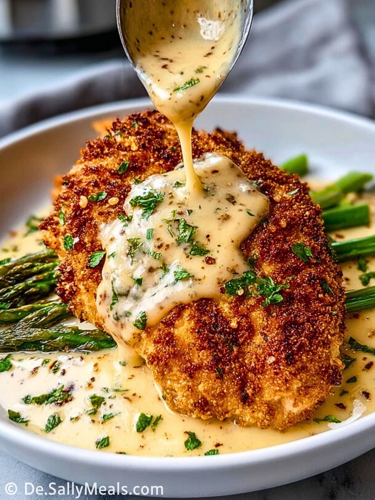 Parmesan steckt gleich doppelt im Rezept: einmal in der Panade für extra Geschmack und Biss, und einmal in der Soße für eine cremige, leicht salzige Note mit Umami.