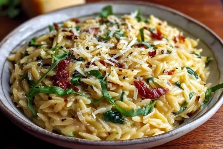 Dieses Gericht überzeugt durch seine ausgewogene Kombination aus cremiger Konsistenz, salziger Würze und frischer Note. Das Orzo gart direkt in der aromatischen Flüssigkeit und nimmt dabei besonders viel Geschmack auf. Zusammen mit Parmesan, Sahne, Zwiebel, Knoblauch und einem Hauch Chili entsteht ein intensives, rundes Aroma, das durch Rucola oder Spinat und knusprigen Speck perfekt ergänzt wird.