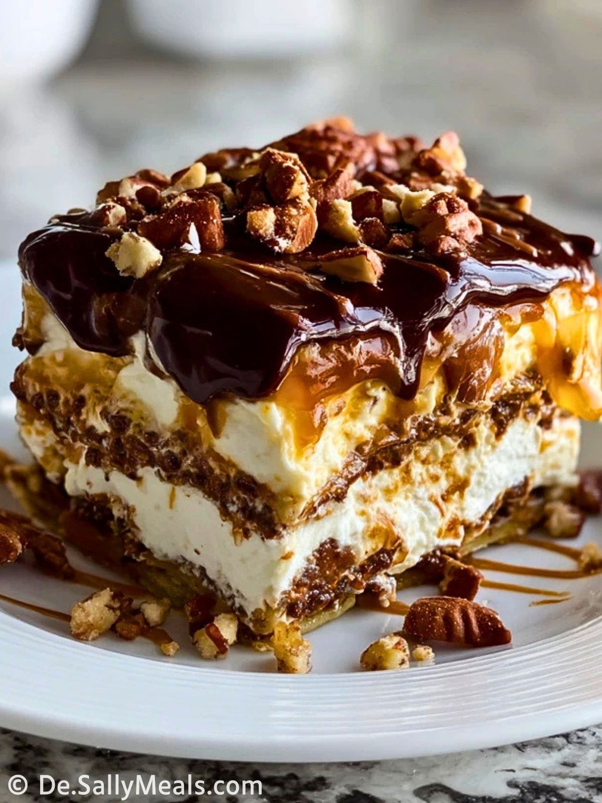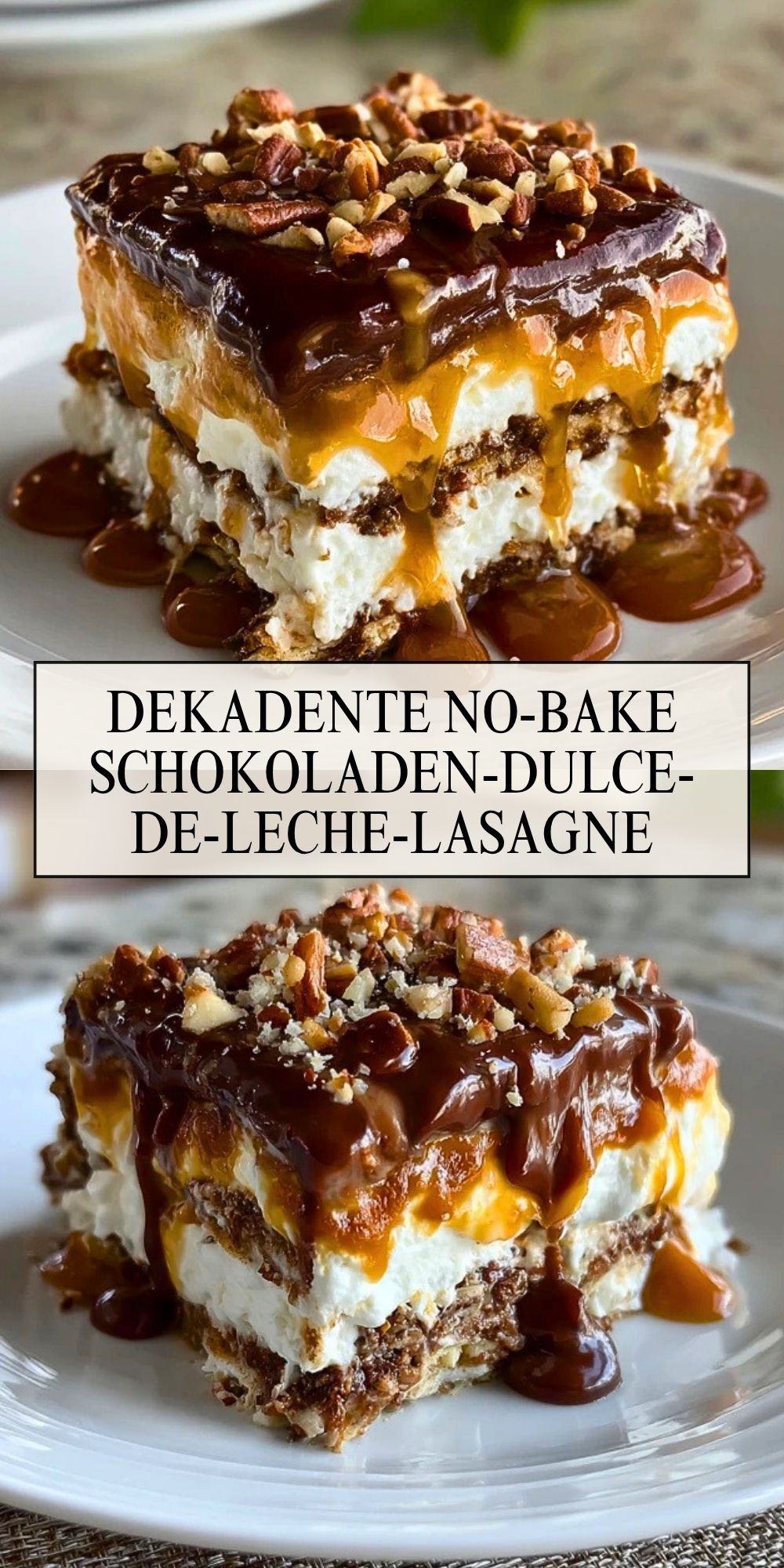 Diese Dekadente No-Bake Schokoladen-Dulce-de-Leche-Lasagne ist ein Dessert für alle, die cremige Schichten, nussigen Crunch und intensive Schokoladennoten lieben. Zwischen einem knusprigen Keksboden und einer luftigen Frischkäse-Sahne-Creme verstecken sich verführerische Lagen aus Dulce de Leche, gehackten Pekannüssen und zartschmelzender Schokoladensauce.
