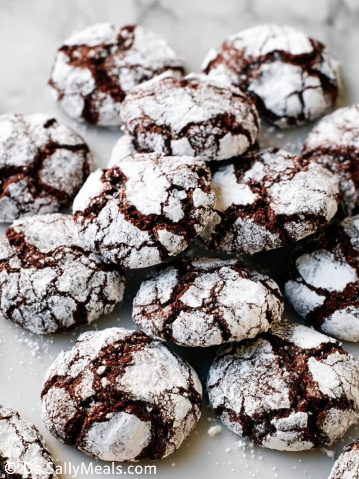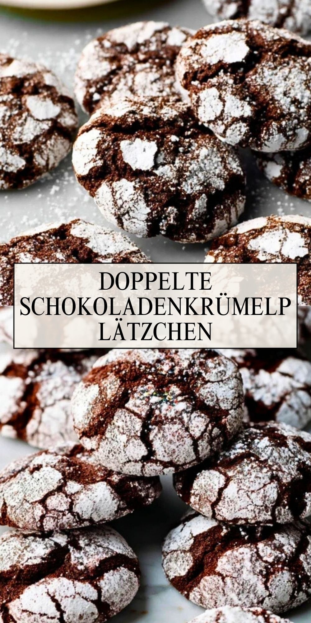 Diese Doppelte Schokoladenkrümelplätzchen sind außen von einer feinen Puderzuckerkruste überzogen und innen wunderbar weich wie kleine Brownies. Beim Backen reißen sie charakteristisch auf und zeigen die dunkle, saftige Schokoladenmitte – ein echter Hingucker auf jedem Plätzchenteller.