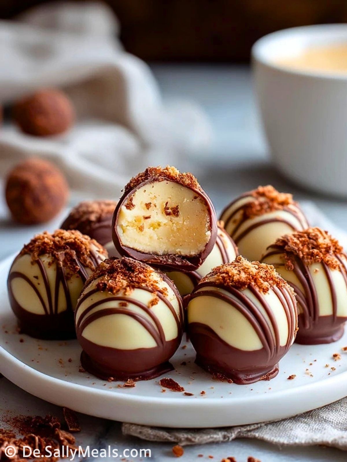Diese Trüffel schmecken leicht gekühlt besonders fein, weil die Füllung dann cremig und die Hülle angenehm knackig bleibt. Auf einer kleinen Platte mit etwas Kakaopulver, geriebener Muskatnuss oder wenigen gehackten Nüssen sehen sie besonders hübsch aus. Sie passen wunderbar zu Kaffee, Espresso oder schwarzem Tee und sind auch ein schönes Mitbringsel aus der Küche.