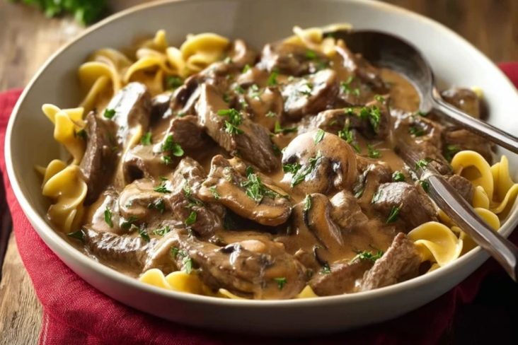 Ein echter Klassiker aus der russischen Küche, jetzt auch als Lieblingsgericht in Deutschland: Zarte Rindfleischstreifen mit Champignons in einer cremigen Sauce, serviert mit breiten Eiernudeln oder Kartoffelpüree. Dieses Gericht ist wärmend, vollmundig und sowohl einfach als auch edel.