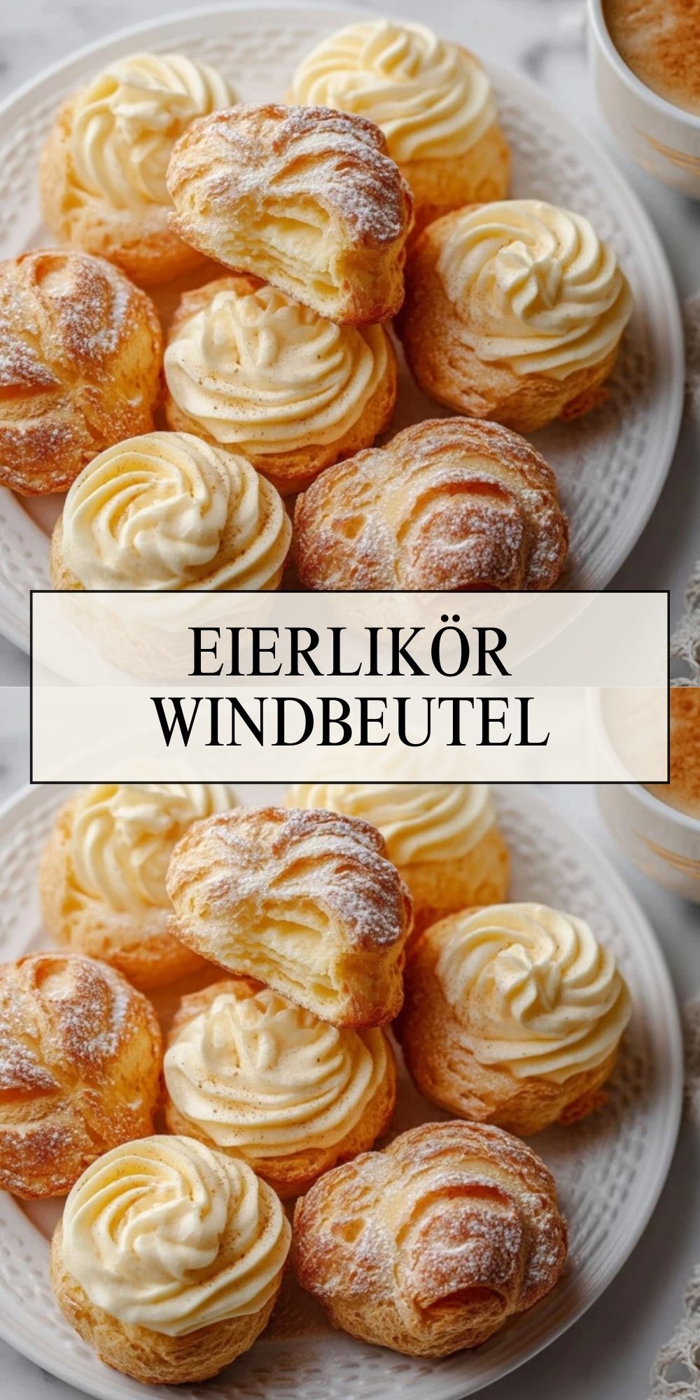 Diese Eierlikör-Windbeutel sind eine raffinierte Mischung aus luftigem Brandteig und einer cremigen Füllung mit feinem Eierlikör-Aroma. Perfekt für festliche Nachmittage, als Highlight auf dem Kaffeetisch oder einfach als Genuss für zwischendurch!