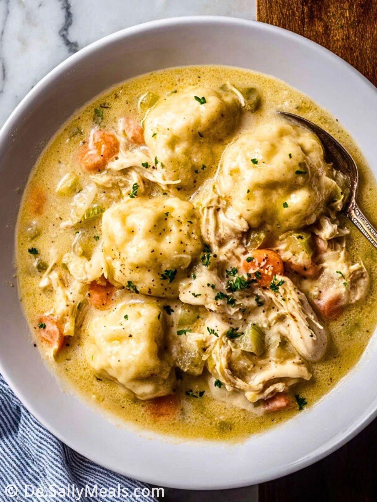 Ein Topf Hähnchen mit Knödeln ist ein herzhaftes Wohlfühlgericht, das Wärme, Sättigung und vertraute Aromen in einer einzigen Schüssel vereint. Zart gegartes Hähnchen, eine cremige Brühe mit Gemüse und lockere Knödel machen dieses Gericht zu einer wunderbaren Wahl für kühle Tage, gemütliche Familienessen oder dann, wenn etwas Bodenständiges auf den Tisch kommen soll.