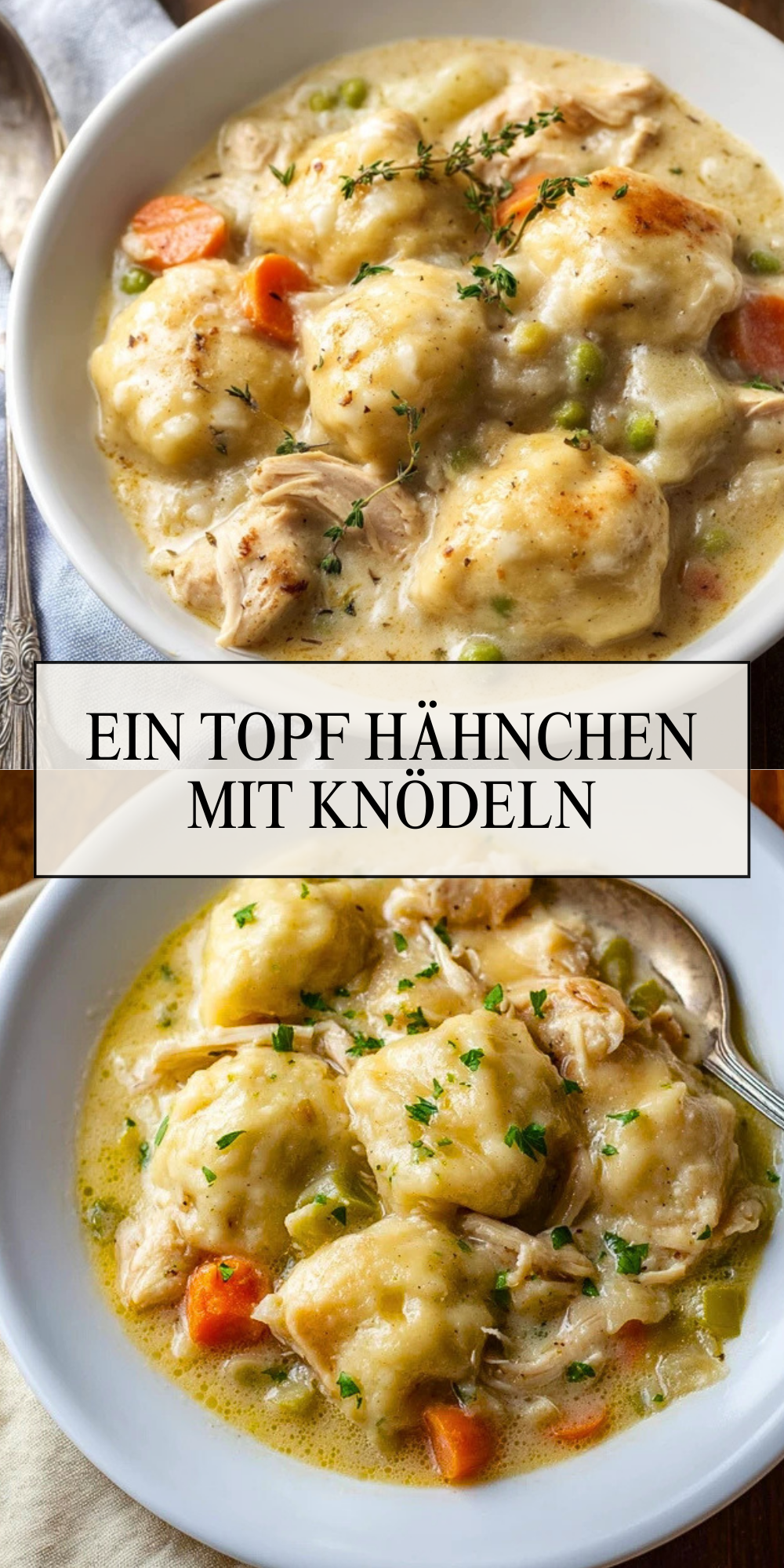 Ein Topf Hähnchen mit Knödeln ist ein cremiges, herzhaftes Wohlfühlgericht mit zartem Hähnchen, Gemüse und lockeren Knödeln. Es passt wunderbar zu kühlen Tagen, lässt sich unkompliziert kochen und bringt den gemütlichen Charakter klassischer Hausmannskost direkt auf den Tisch.