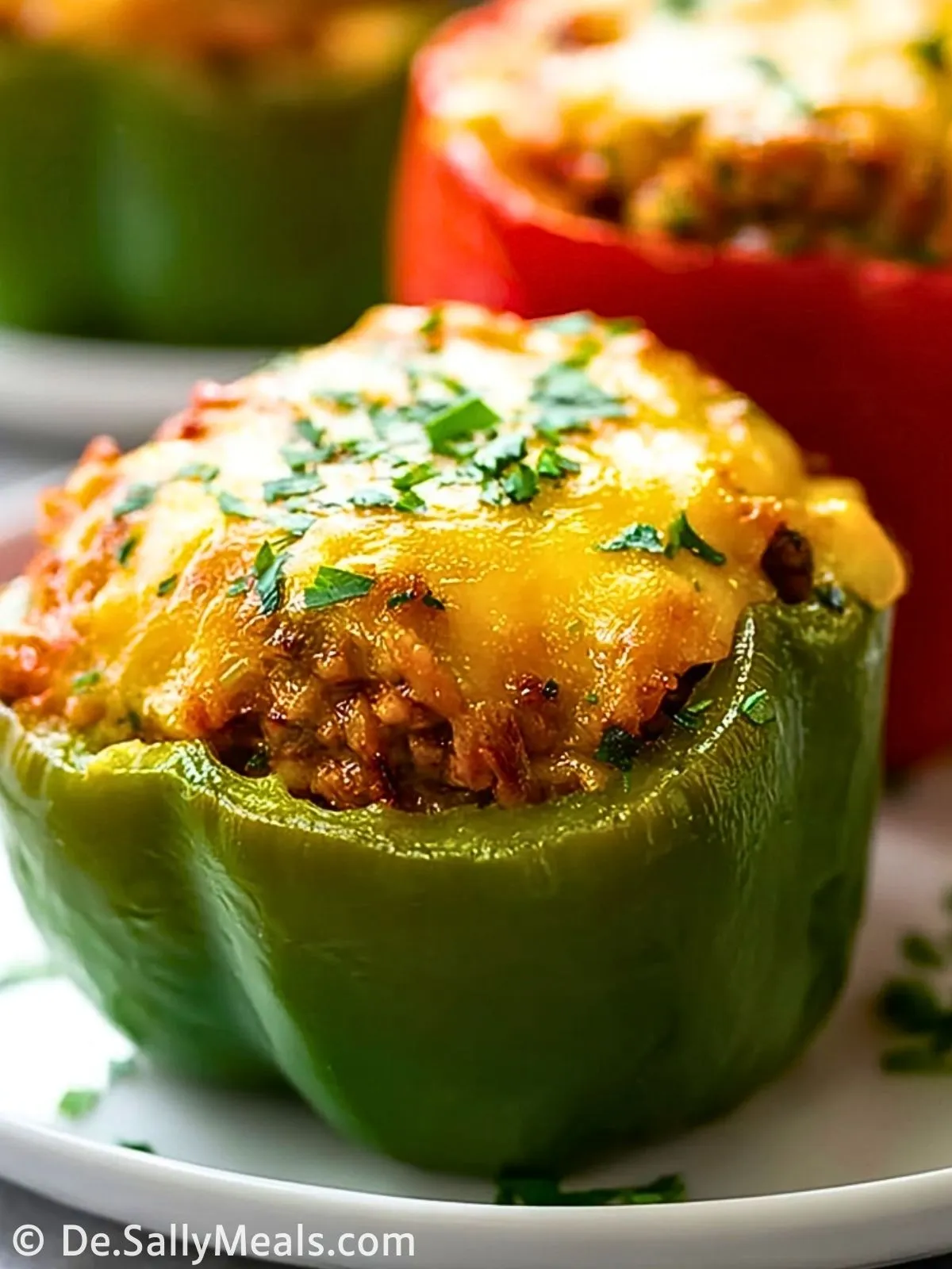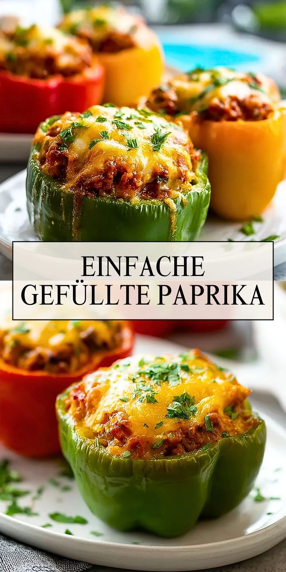 Saftige gefüllte Paprika mit würziger Hackfleisch-Reis-Füllung, frischen Kräutern und goldgelb überbackenem Käse. Ein Klassiker der Hausmannskost, ideal als sättigendes Mittag- oder Abendessen und perfekt zum Vorbereiten.