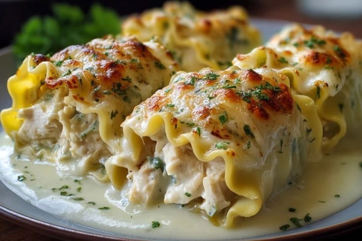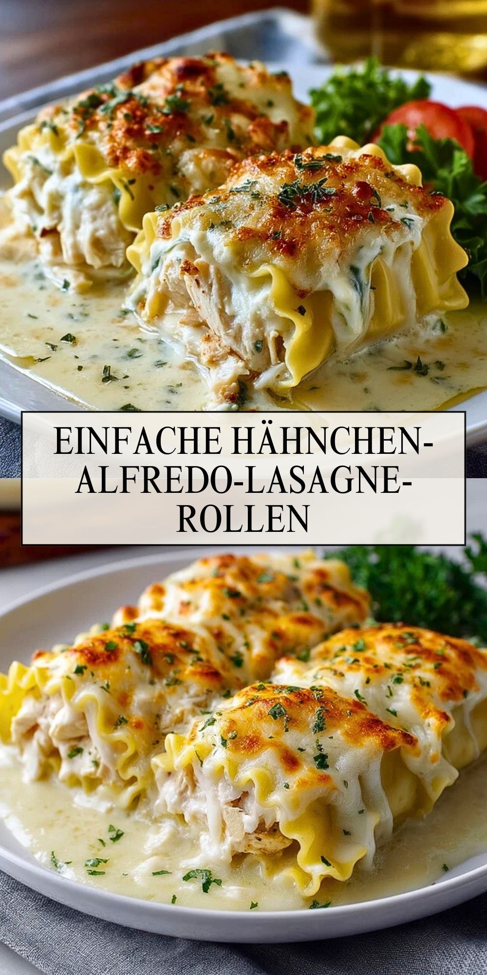 Der größte Vorteil dieses Rezepts: Du kannst gekochtes Hähnchen verwenden, das du vielleicht ohnehin schon im Kühlschrank hast – vom Vortag, vom Sonntagsbraten oder einfach aus dem Supermarkt als fertig gegarte Hähnchenbrust. Die Alfredo-Sauce wird in wenigen Minuten auf dem Herd angerührt, während die Lasagneplatten kochen. Anschließend wird alles nur noch gefüllt, gerollt und überbacken. Ohne komplizierte Schritte, ohne lange Wartezeiten – und trotzdem mit einem Geschmack wie aus einem guten italienischen Restaurant.