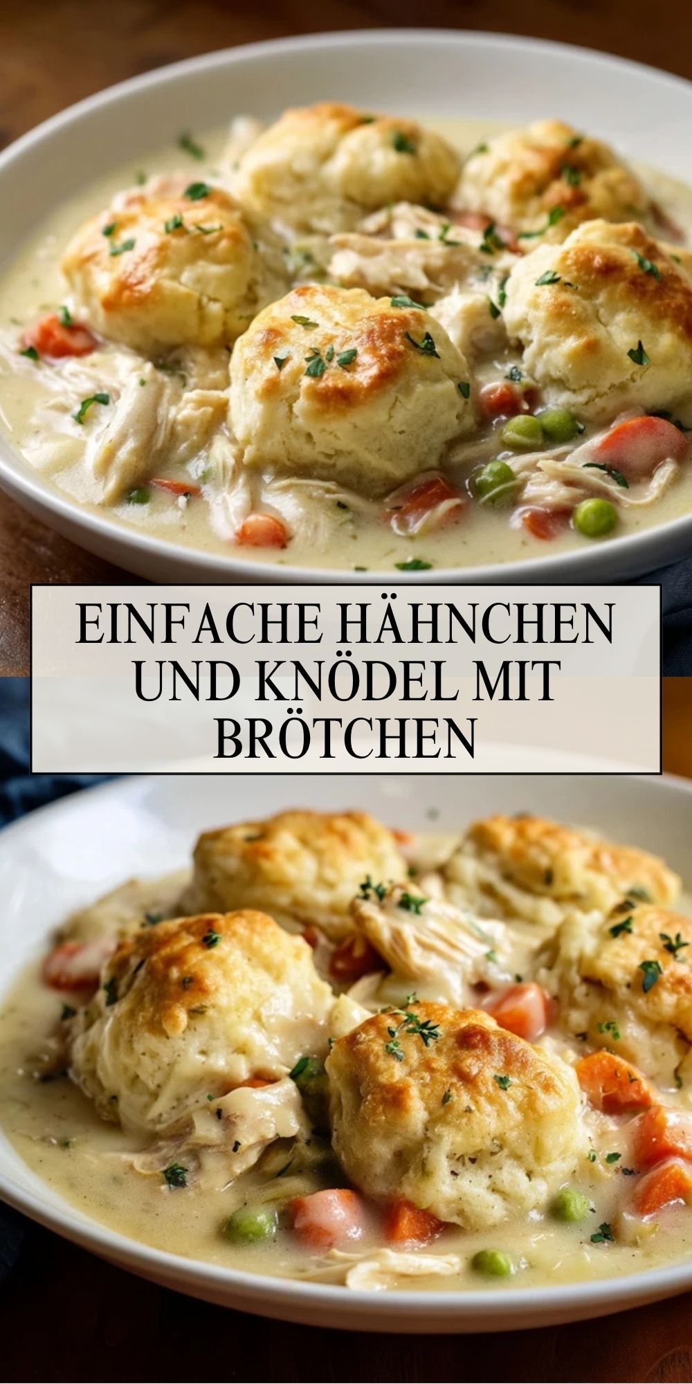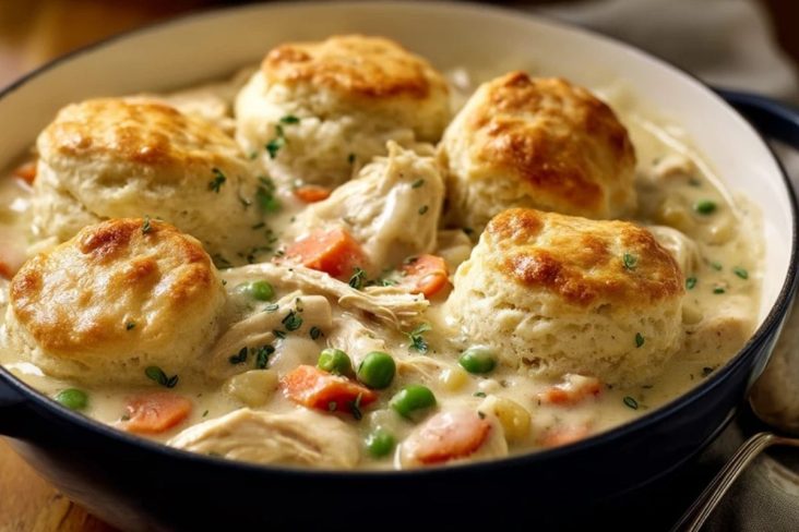 Dieses Gericht ist pures Wohlfühlessen: zartes Hähnchen, eine cremige Sauce mit Gemüse und goldbraun gebackene Knödel aus Brötchenteig, die jeden Löffel noch herzhafter machen. Es verbindet den gemütlichen Charakter eines klassischen Eintopfs mit der sättigenden Wärme eines Ofengerichts und passt wunderbar zu kühlen Tagen, Familienessen oder einem entspannten Abendessen unter der Woche.