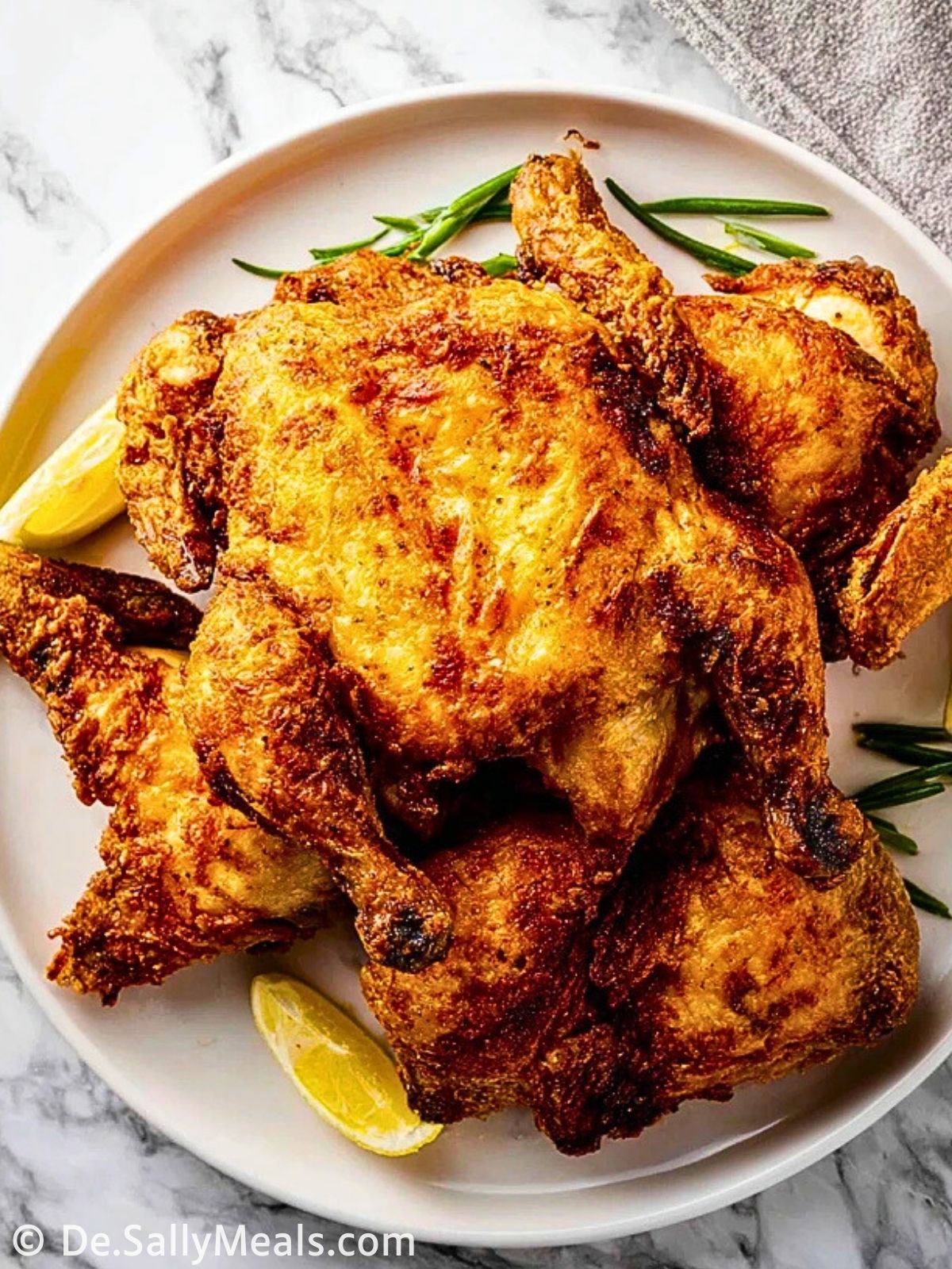 Das fertige Hähnchen aus der Heißluftfritteuse nehmen und vor dem Anschneiden 5–10 Minuten ruhen lassen, damit die Säfte sich verteilen. In Stücke schneiden und mit Zitronenspalten und Lieblingsbeilagen servieren.