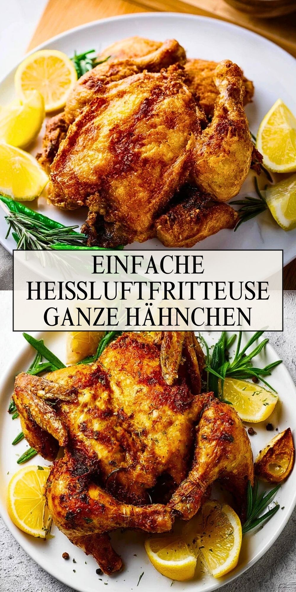 Knuspriges, goldbraunes Hähnchen aus der Heißluftfritteuse – außen wunderbar kross, innen herrlich saftig. Mit aromatischer Gewürzmischung und Zitrone perfekt für ein unkompliziertes Familienessen oder Sonntagsgericht. Schnell zubereitet und immer ein Genuss!