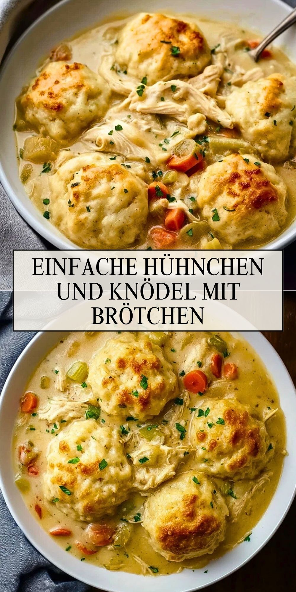 Herzhafte Gerichte wie dieses cremige Hühnchen mit Knödeln sind in den kalten Monaten ein echtes Wohlfühl-Essen. Zartes Hühnchenfleisch, buntes Gemüse und goldbraun gebackene Knödel verbinden sich in einer aromatischen Sauce zu einem Familienklassiker. Die Brötchen-Knödel saugen die würzige Soße perfekt auf und machen das Gericht besonders sättigend.