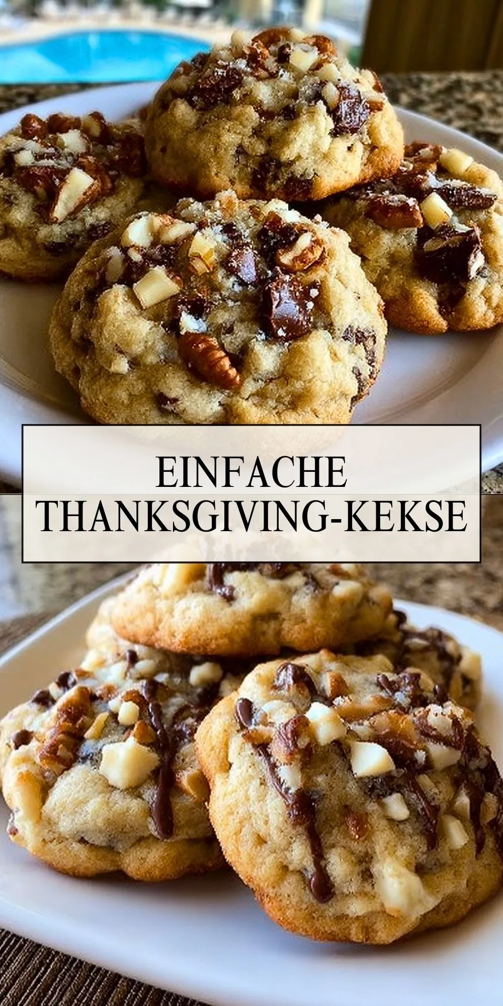 Diese einfachen Thanksgiving-Kekse verbinden weichen Teig, knackige Pekannüsse und zartschmelzende Schokolade. Perfekt für den Herbst, Feiertage oder einen gemütlichen Kaffee-Nachmittag – in nur 30 Minuten gebacken!