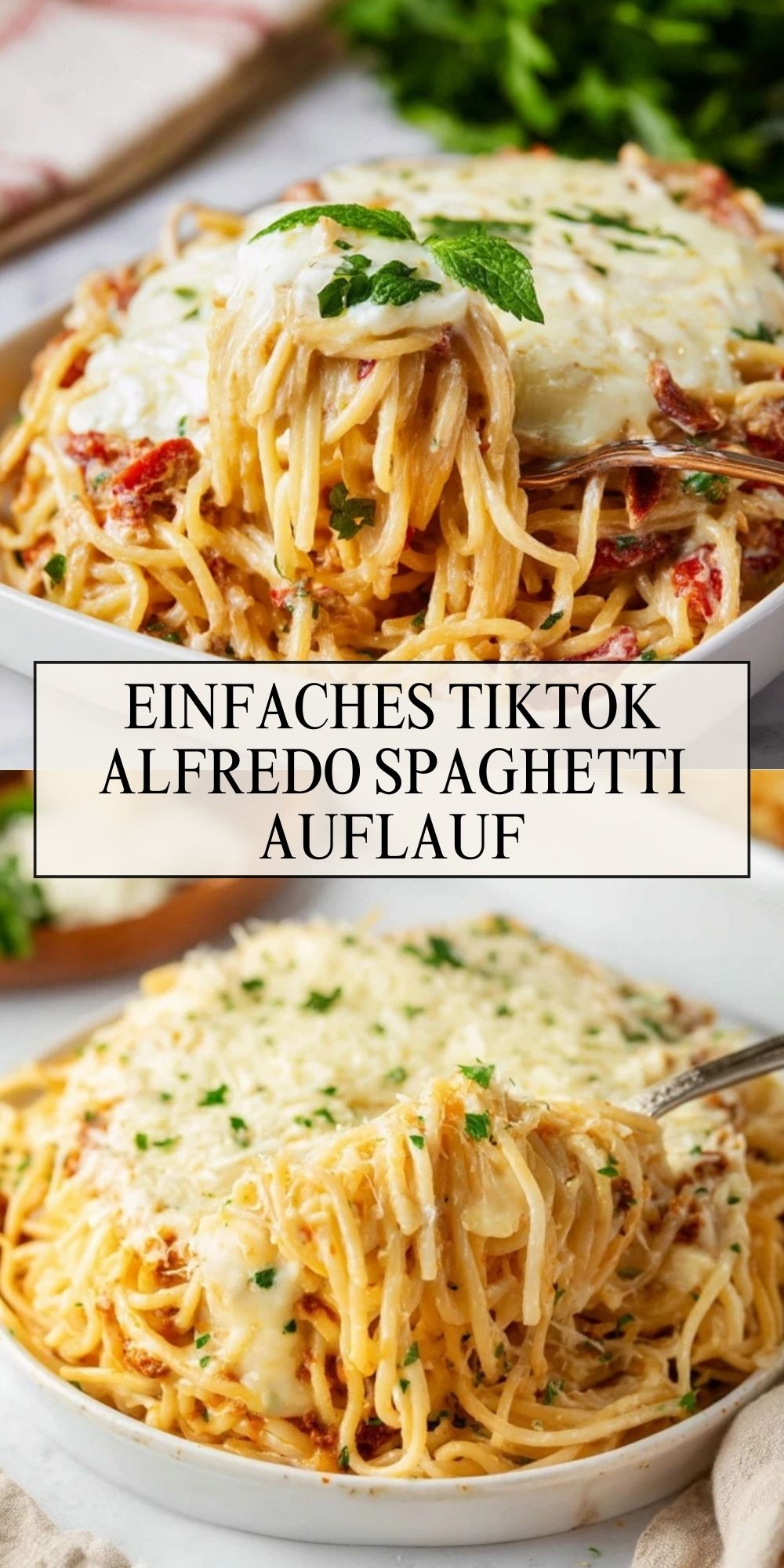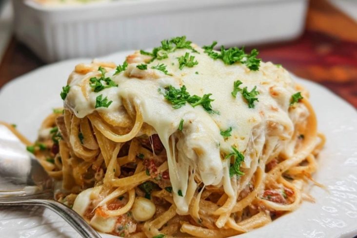 Der Hit an diesem Rezept ist die Kombination aus minimalem Aufwand und maximaler Cremigkeit. Die Spaghetti werden nur knapp bissfest gekocht, dann mit einer schnellen Alfredo-Sauce aus Sahne, Frischkäse und Parmesan vermischt und im Ofen mit einer dicken Schicht Mozzarella überbacken. Getrocknete Tomaten und frische Petersilie bringen Farbe und einen kleinen Geschmacks-Kick ins Spiel. Alles in einer Form, ohne komplizierte Schritte – genau die Art Gericht, die auf Social Media viral geht.