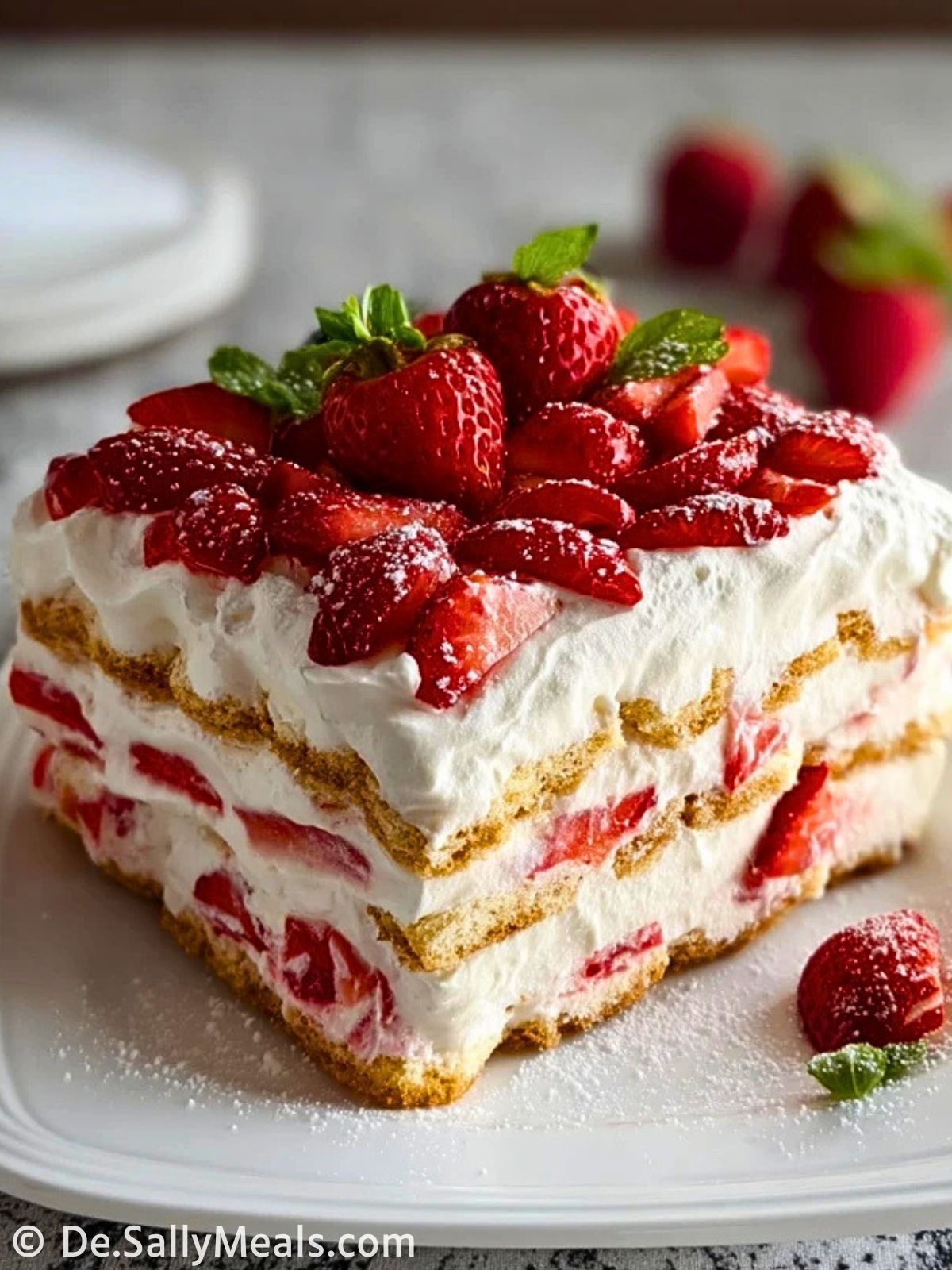 Und lass mich in den Kommentaren wissen, wie deine Version geworden ist. Hast du zusätzliche Erdbeerschichten gemacht oder die Creme mit etwas Zitrone verfeinert? Vielleicht hast du den Kuchen sogar mit Löffelbiskuits statt Butterkeksen ausprobiert?