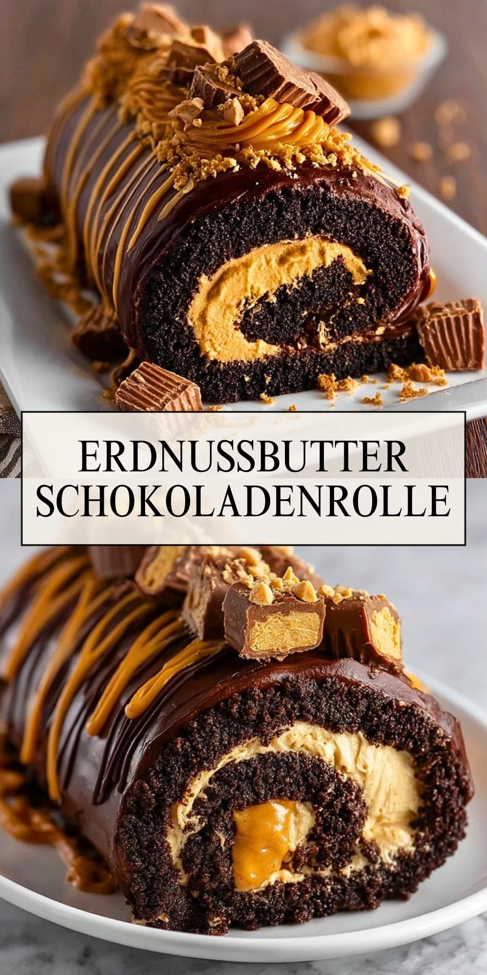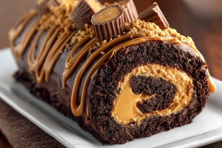 Diese Erdnussbutter-Schokoladenrolle kombiniert einen weichen, saftigen Schokoladenboden mit einer cremigen Erdnussbutterfüllung und einer glänzenden Schokoladenglasur. Sie ist ein eindrucksvolles Dessert für besondere Anlässe, lässt sich gut vorbereiten und schmeckt gekühlt besonders fein.