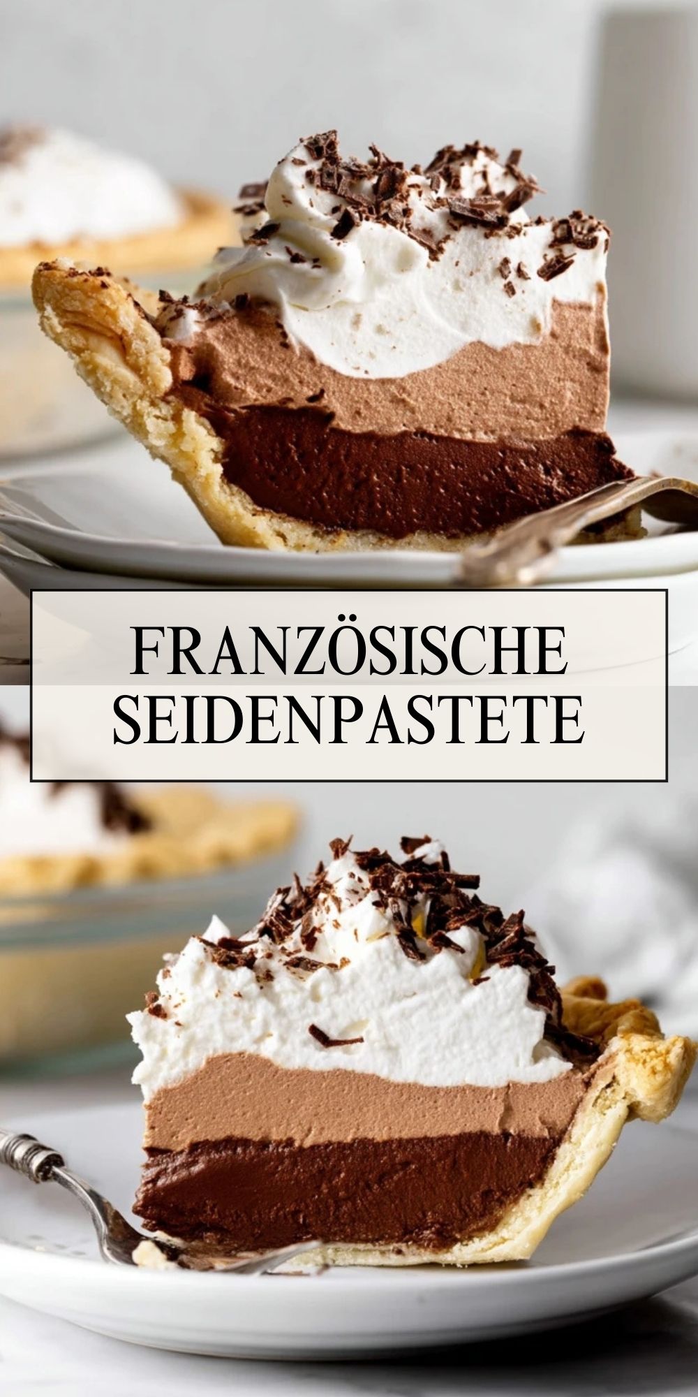 Diese Französische Seidenpastete besteht aus einem zarten Mürbeteigboden, einer tief schokoladigen Puddingschicht, einer luftigen Seiden-Mousse und einer dicken Haube aus süßer Schlagsahne – ein luxuriöses Dessert, das sich gut vorbereiten lässt und bei jedem Anlass beeindruckt.