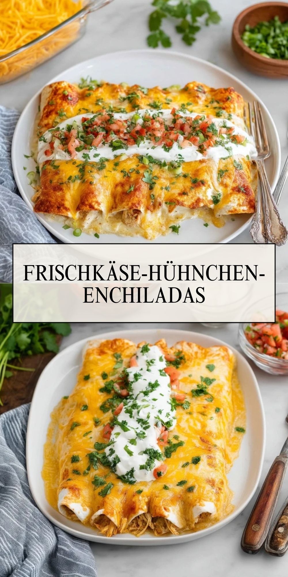 Saftige Frischkäse-Hühnchen-Enchiladas sind ein absolutes Wohlfühlgericht, das mit zartem Hähnchen, cremigem Frischkäse und würziger Sauce begeistert. Das Zusammenspiel von geschmolzenem Käse, einer aromatischen Füllung und der goldbraunen Kruste aus dem Ofen sorgt für ein unvergessliches Geschmackserlebnis, das die ganze Familie lieben wird. Die frischen Toppings wie gehackte Kräuter und Tomaten geben dem Gericht eine angenehme Frische und Farbe.