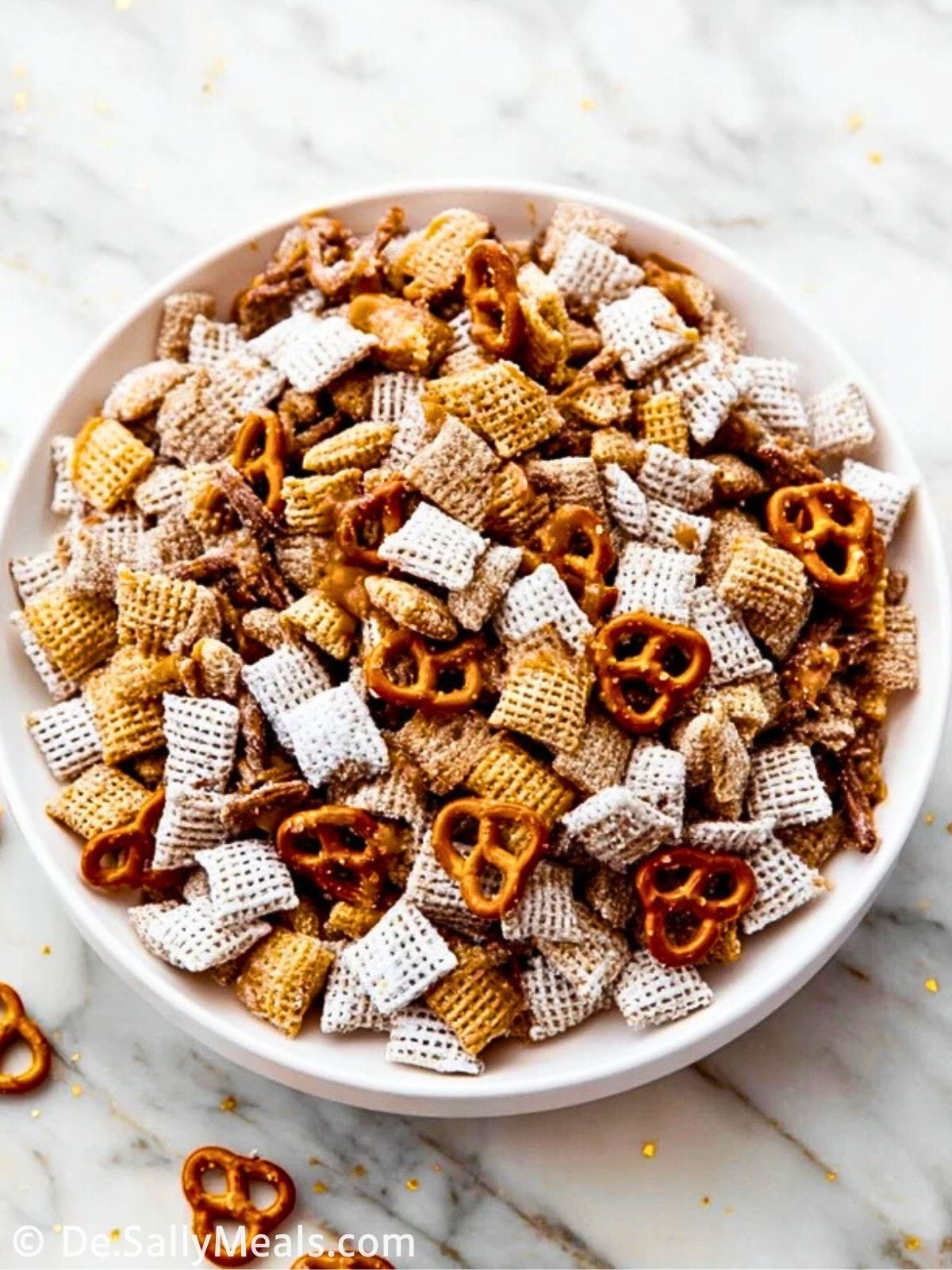 1. Die Salzbrezeln grob zerbrechen und zusammen mit dem Knuspermüsli in eine große Schüssel geben.