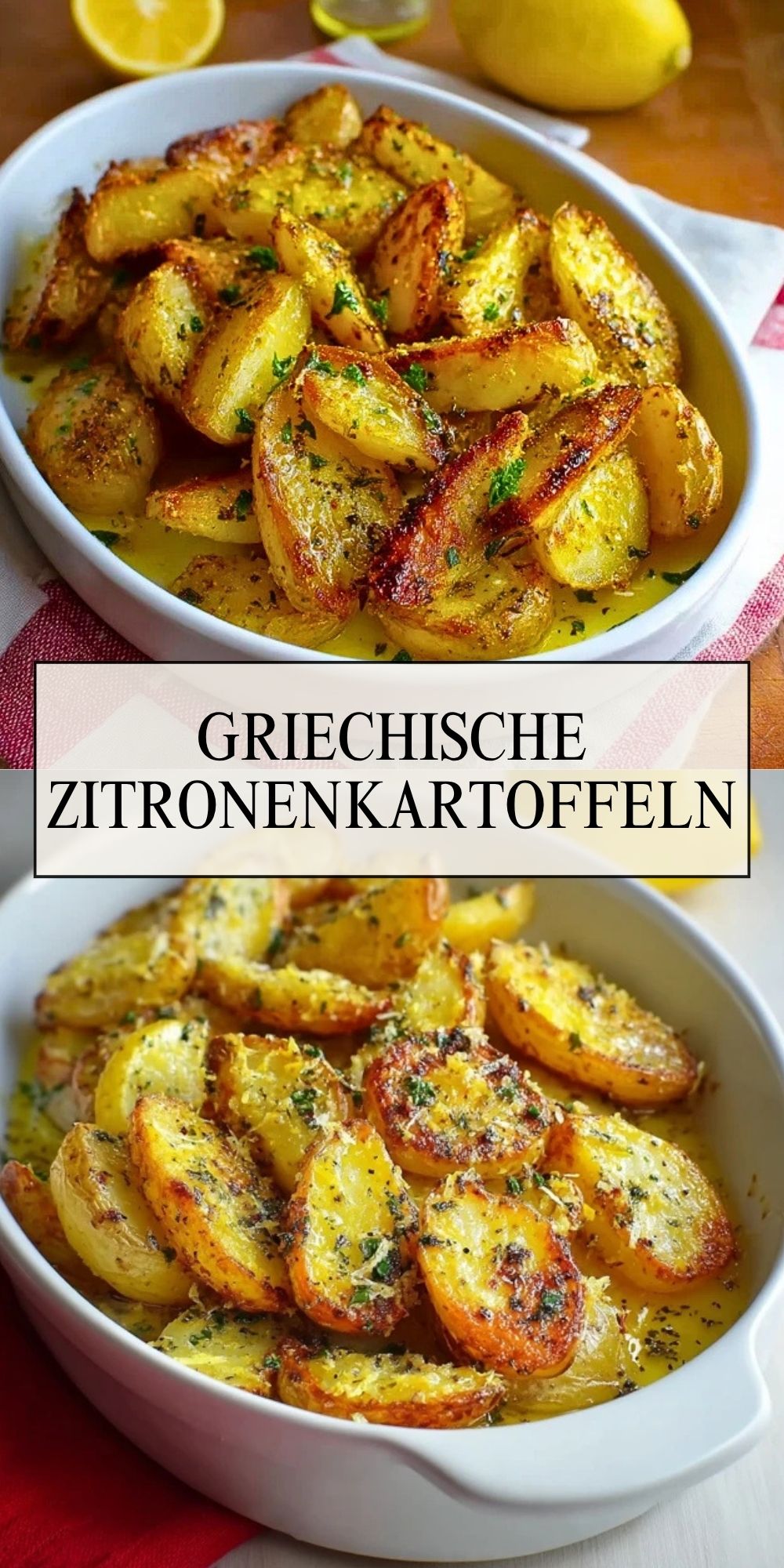Goldbraun geröstet, innen zart und voller mediterraner Aromen: Griechische Zitronenkartoffeln sind eine einfache, aber außergewöhnlich geschmackvolle Ofenbeilage. Zitronensaft, Olivenöl, Knoblauch und Kräuter ziehen tief in die Kartoffeln ein und sorgen für eine perfekte Mischung aus Frische, Würze und Röstaromen. Sie passen wunderbar zu Fleisch, Fisch oder Gemüse und schmecken auch pur mit einem Dip einfach hervorragend.