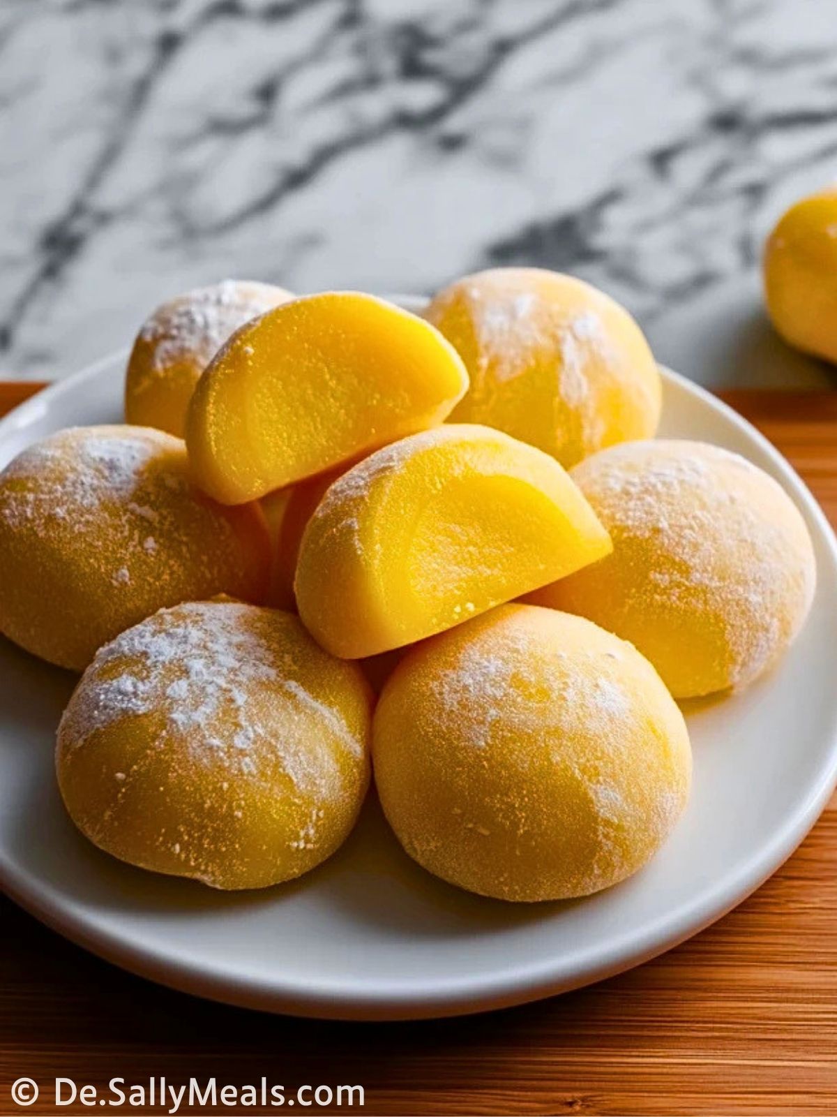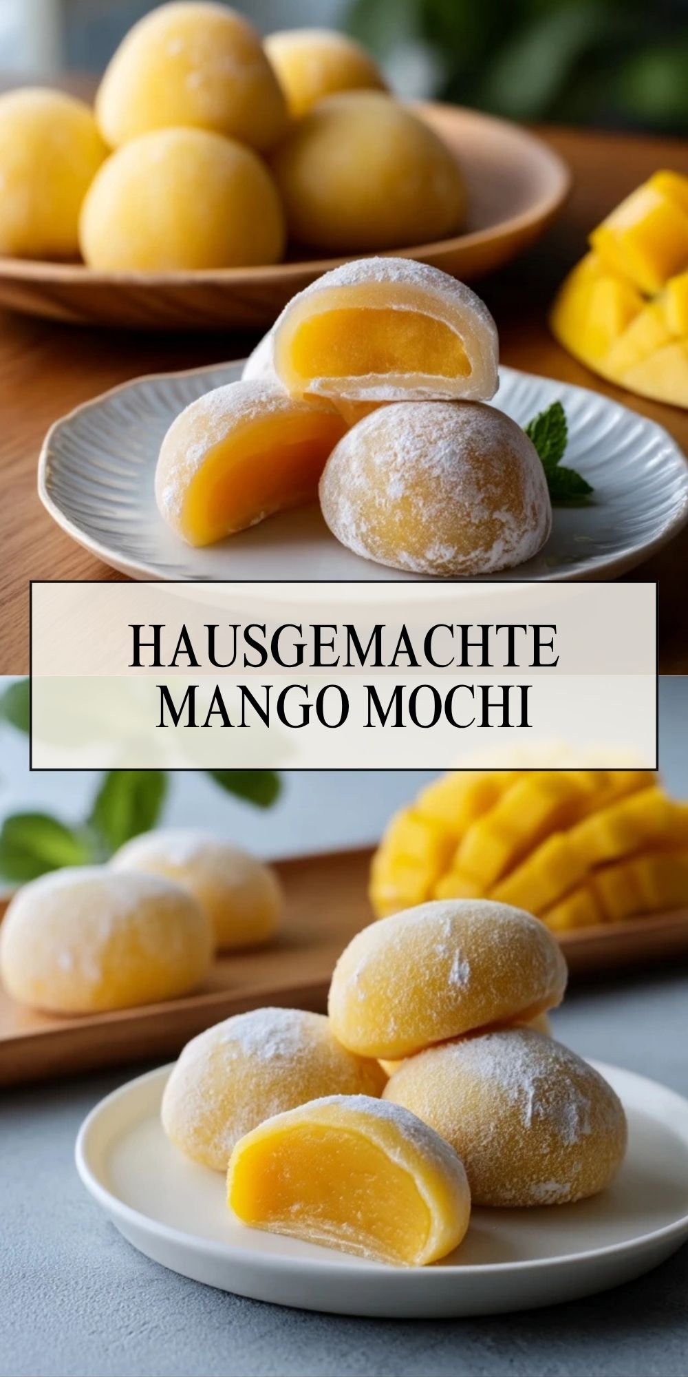 Vor dem Servieren kannst du überschüssigen Puderzucker vorsichtig abklopfen. Besonders hübsch wirken die Mochi, wenn du eines davon halbierst und die goldene Mangofüllung sichtbar präsentierst.