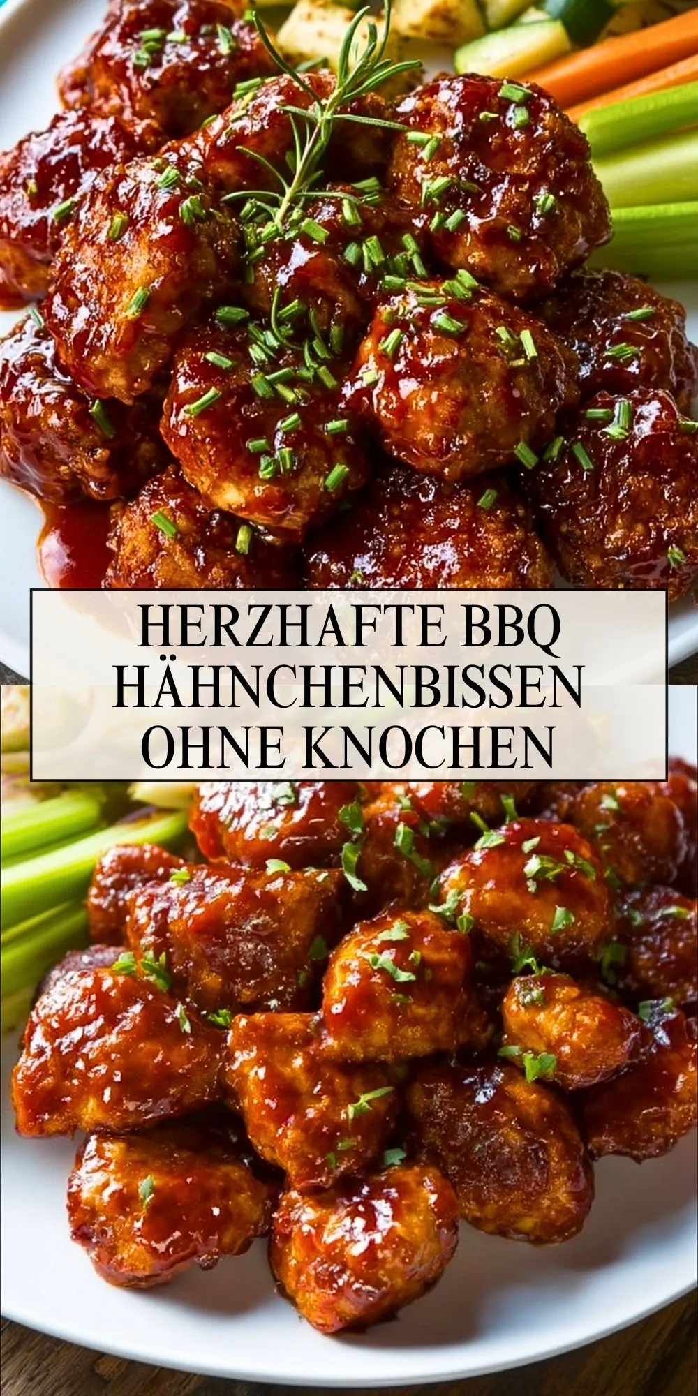Diese herzhaften BBQ Hähnchenbissen ohne Knochen sind außen leicht knusprig, innen zart und saftig und werden in einer würzig-rauchigen BBQ-Sauce serviert. Perfekt als Fingerfood, Partysnack oder schnelles Abendessen. Frische Kräuter und ein Spritzer Zitrone geben ihnen den letzten Kick!
