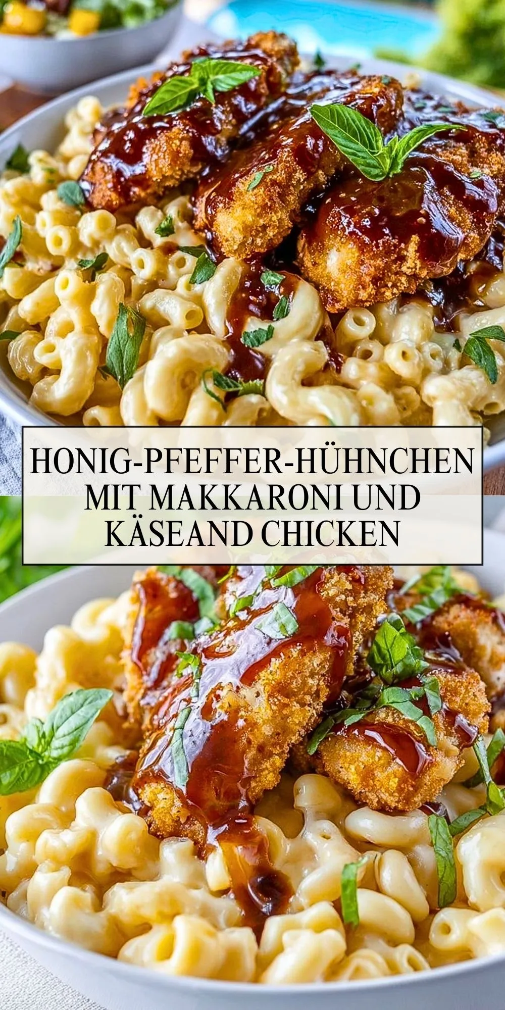 Knusprig paniertes Honig-Pfeffer-Hühnchen trifft auf cremige Makkaroni und Käse – ein Wohlfühlgericht, das mit süßer, pikanter Sauce und samtiger Käsesauce garantiert alle begeistert.