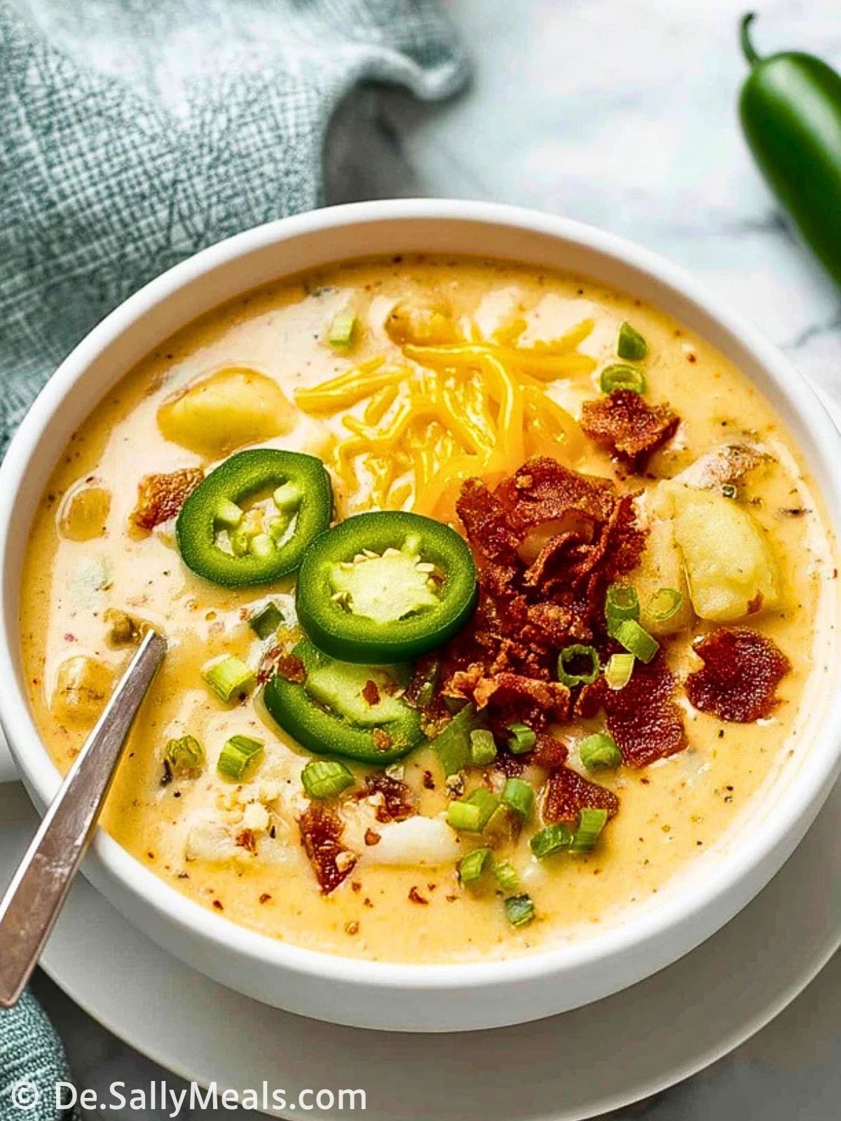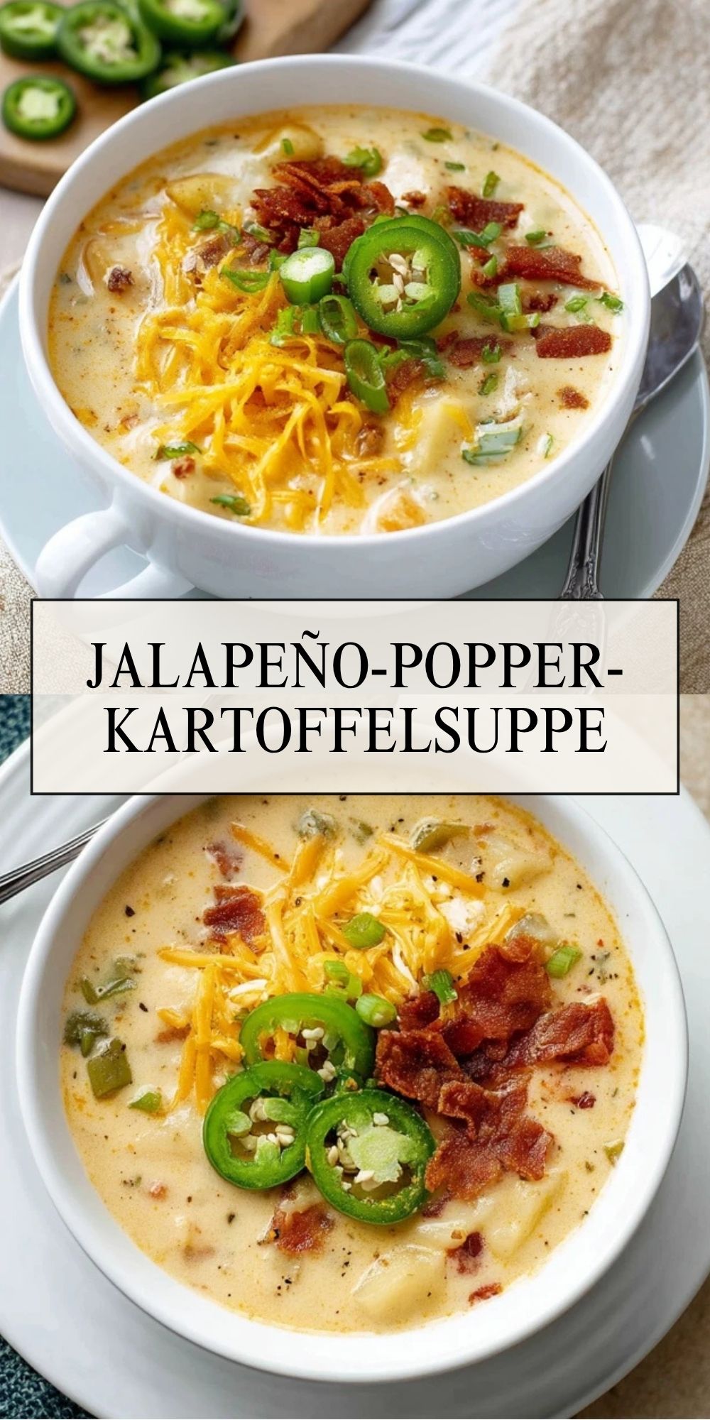 Schmecke die Suppe mit Salz ab und verteile sie auf Schalen. Garniere sie mit dem knusprigen Bacon, zusätzlichen Jalapeño-Scheiben, Frühlingszwiebeln und etwas extra Cheddar, wenn du magst.