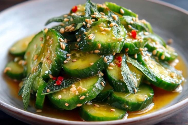 Richte den Japanischen Gurkensalat in einer flachen Schale oder auf einem Teller an und garniere ihn mit etwas zusätzlichem Sesam und einigen Minzblättern.
