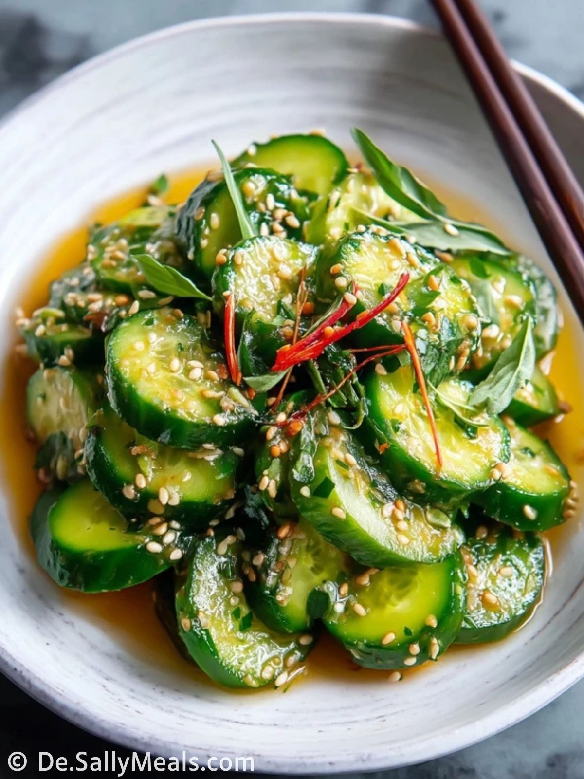 Dieser Salat schmeckt am besten gut gekühlt und frisch zubereitet. Er passt hervorragend zu Sushi, gebratenem Lachs, Teriyaki-Hähnchen, Reisbowls oder auch zu knusprigem Tofu. Wenn du ihn im Voraus vorbereiten möchtest, lagere ihn in einem luftdichten Behälter im Kühlschrank und genieße ihn möglichst innerhalb von 24 Stunden, damit die Gurken knackig bleiben.