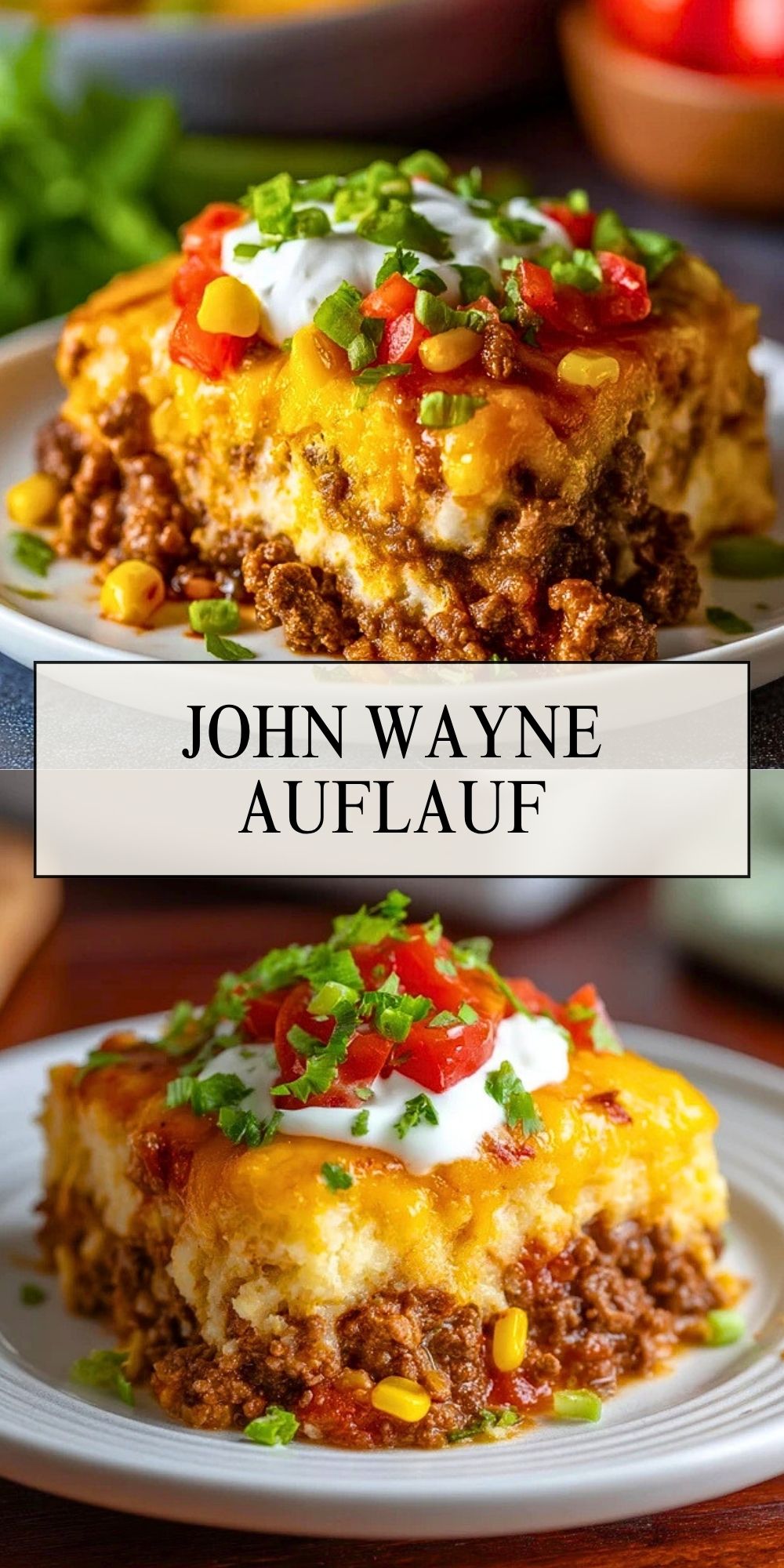 Ein herzhafter John-Wayne-Auflauf mit würzigem Hackfleisch, Paprika, Tomaten, Mais, cremiger Käsemischung und goldbraun überbackener Oberfläche. Dieses unkomplizierte Ofengericht ist ideal für die Familienküche, lässt sich gut vorbereiten und schmeckt wunderbar saftig, würzig und sättigend.