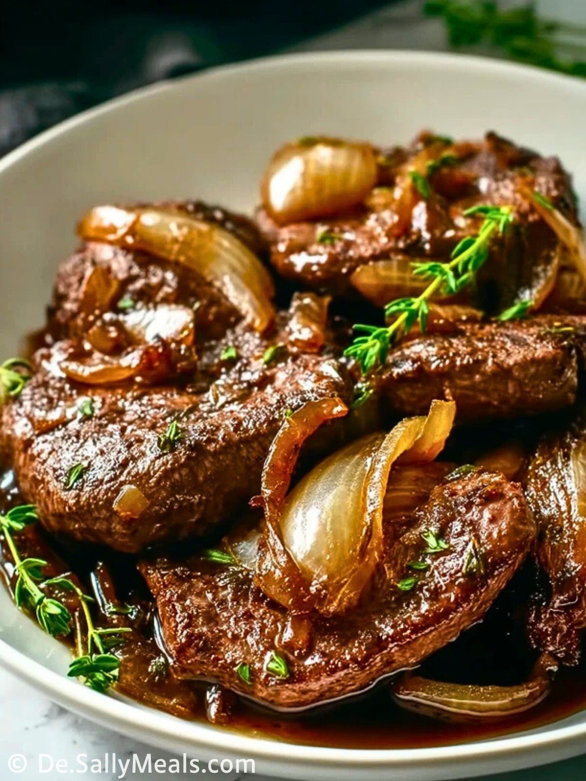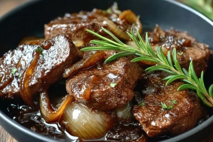 Diese Karamellisierte Zwiebelrinderleber ist ein klassisches, herzhaftes Pfannengericht mit zarter Leber, süßlich geschmorten Zwiebeln und einer kräftigen, aromatischen Sauce. Durch die kurze Garzeit bleibt die Leber saftig, während Balsamico, Brühe und Rosmarin dem Gericht eine runde, rustikale Tiefe verleihen.