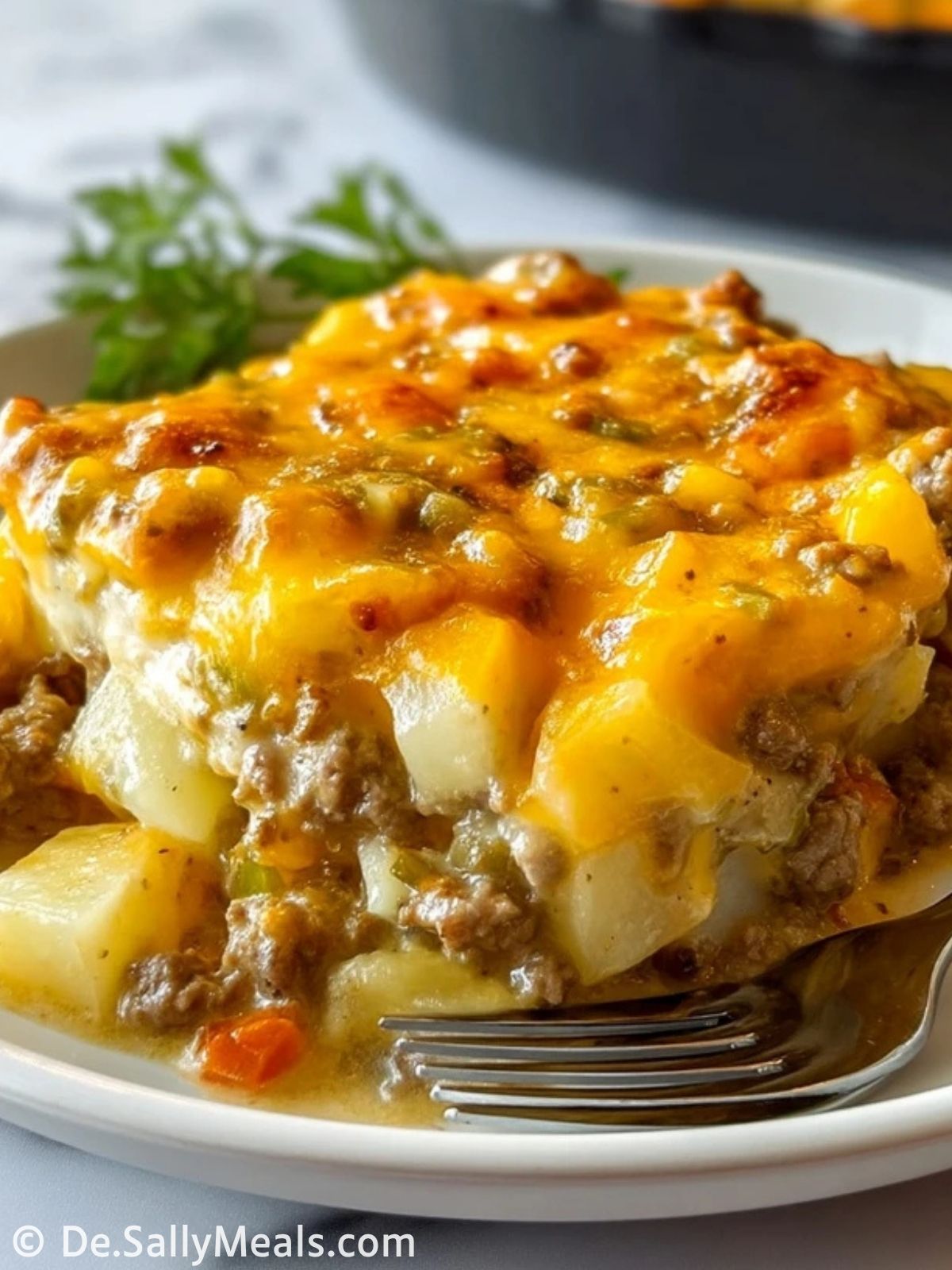 Backe den Auflauf etwa 35 bis 40 Minuten, bis die Kartoffeln weich sind und der Käse schön geschmolzen und goldbraun ist. Vor dem Servieren 5 bis 10 Minuten ruhen lassen, damit sich die Schichten besser setzen.