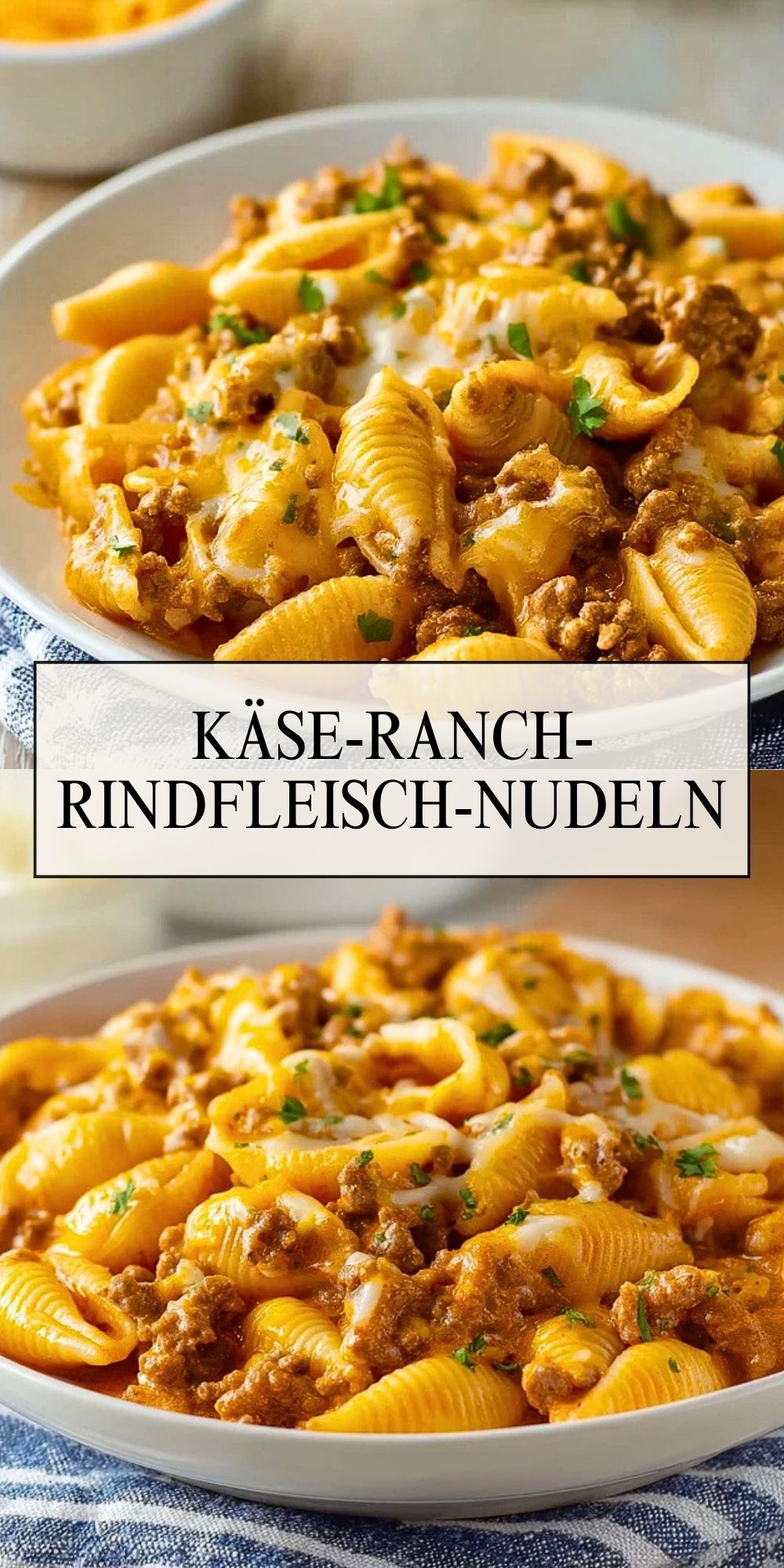 Probiere die Pasta und passe bei Bedarf die Würzung mit Salz, Pfeffer oder etwas zusätzlicher Ranch-Gewürzmischung an. Richte die Käse-Ranch-Rindfleisch-Nudeln auf tiefen Tellern an, bestreue sie mit frisch gehackter Petersilie oder Schnittlauch und – wenn du magst – mit einem zusätzlichen Klecks Sauerrahm oder etwas extra geriebenem Käse.