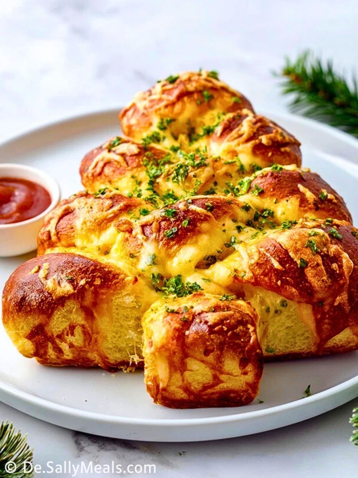 Lass das Käse Weihnachtsbaum Brot kurz abkühlen und serviere es warm zusammen mit Tomatensauce oder deinem Lieblingsdip.