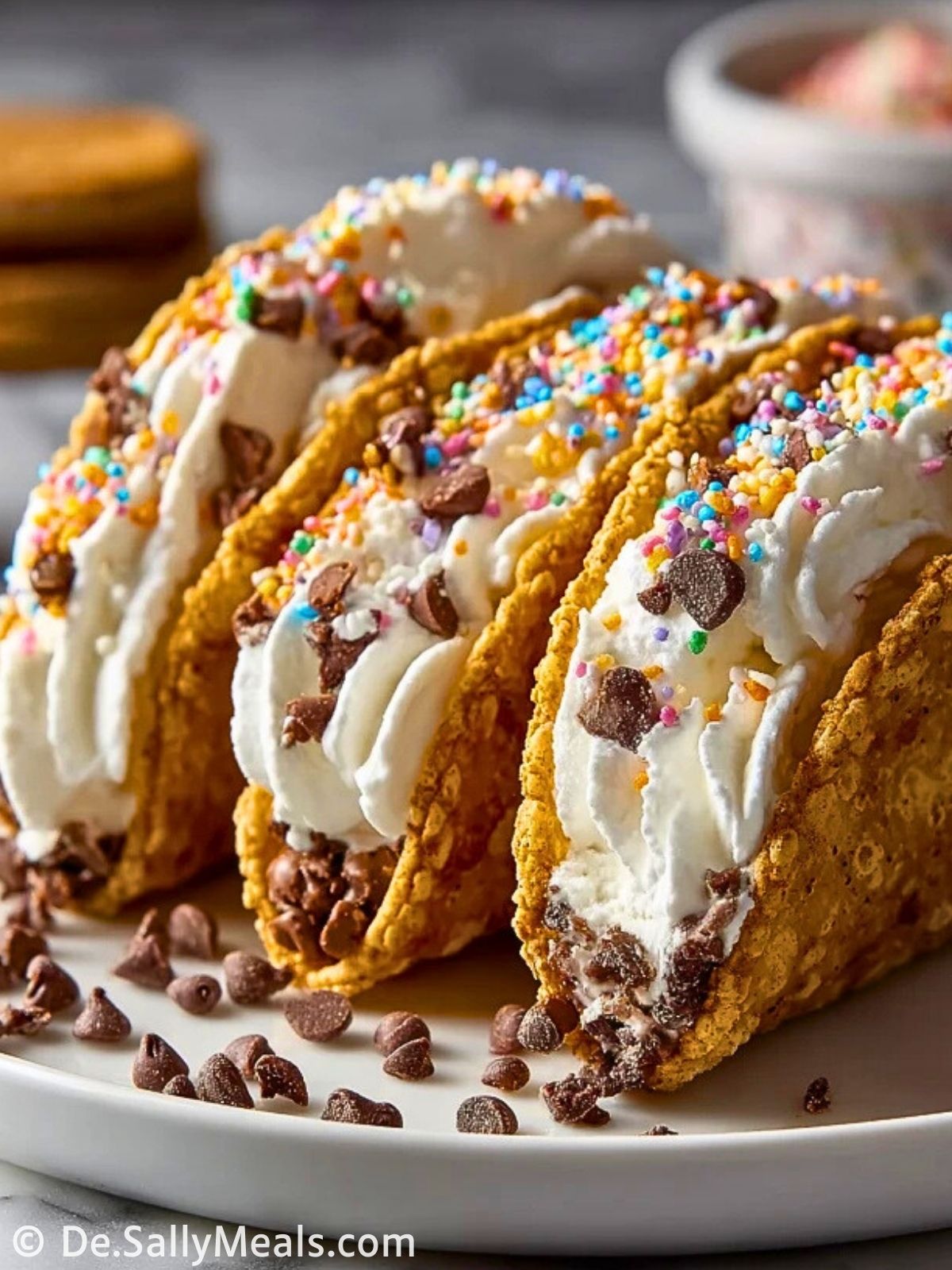 Die gefüllten Tacos nach Belieben mit Keksstreuseln, Schokodrops und etwas Schokoladensauce verzieren. Bis zum Servieren kühl stellen.