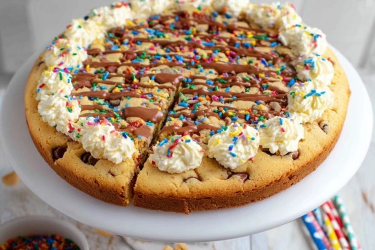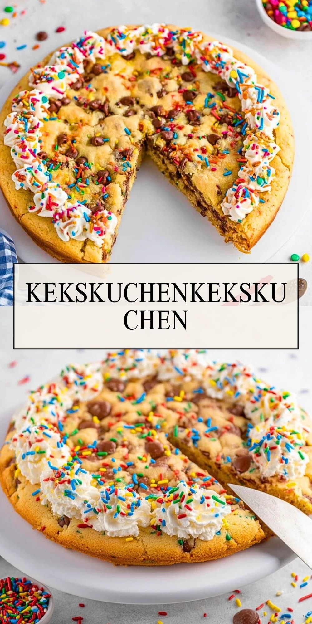 Dieser Kekskuchen ist ein riesiger, weicher Chocolate-Chip-Cookie aus der Springform, getoppt mit Sahnetuffs, Schokosauce und bunten Streuseln – perfekt für Geburtstage, Kinderpartys oder wenn du schnell einen besonderen Kuchen ohne großen Aufwand brauchst.