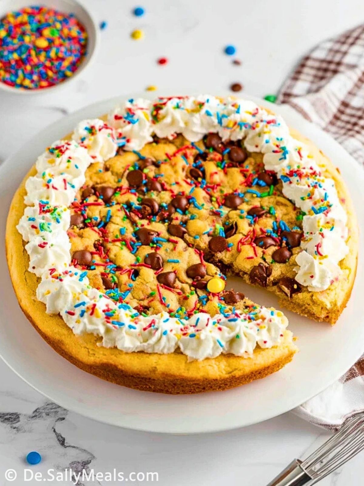 - Geburtstags-Cookie-Pizza mit Smarties, bunten Streuseln und Vanillefrosting.