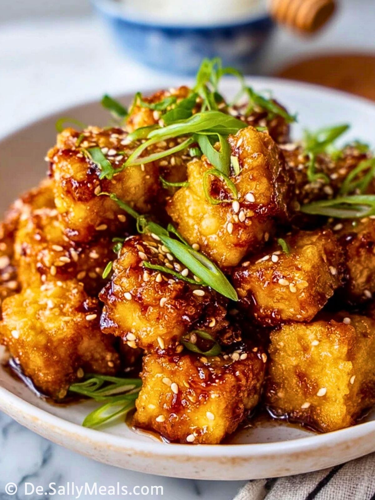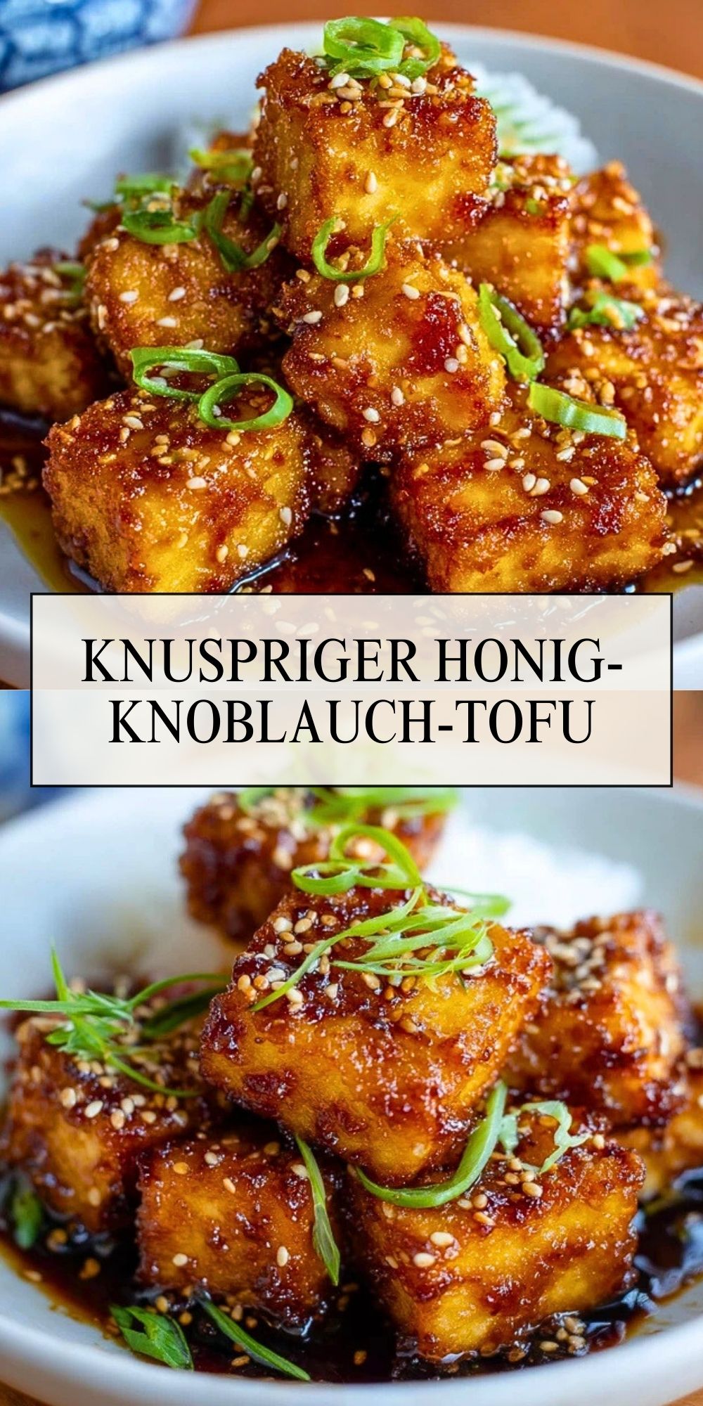 Knuspriger Honig-Knoblauch-Tofu ist ein einfaches, aber raffiniertes Pfannengericht, bei dem goldbraun gebratener Tofu in einer süß-salzigen Honig-Knoblauch-Sauce geschwenkt und mit Sesam sowie Frühlingszwiebeln serviert wird.